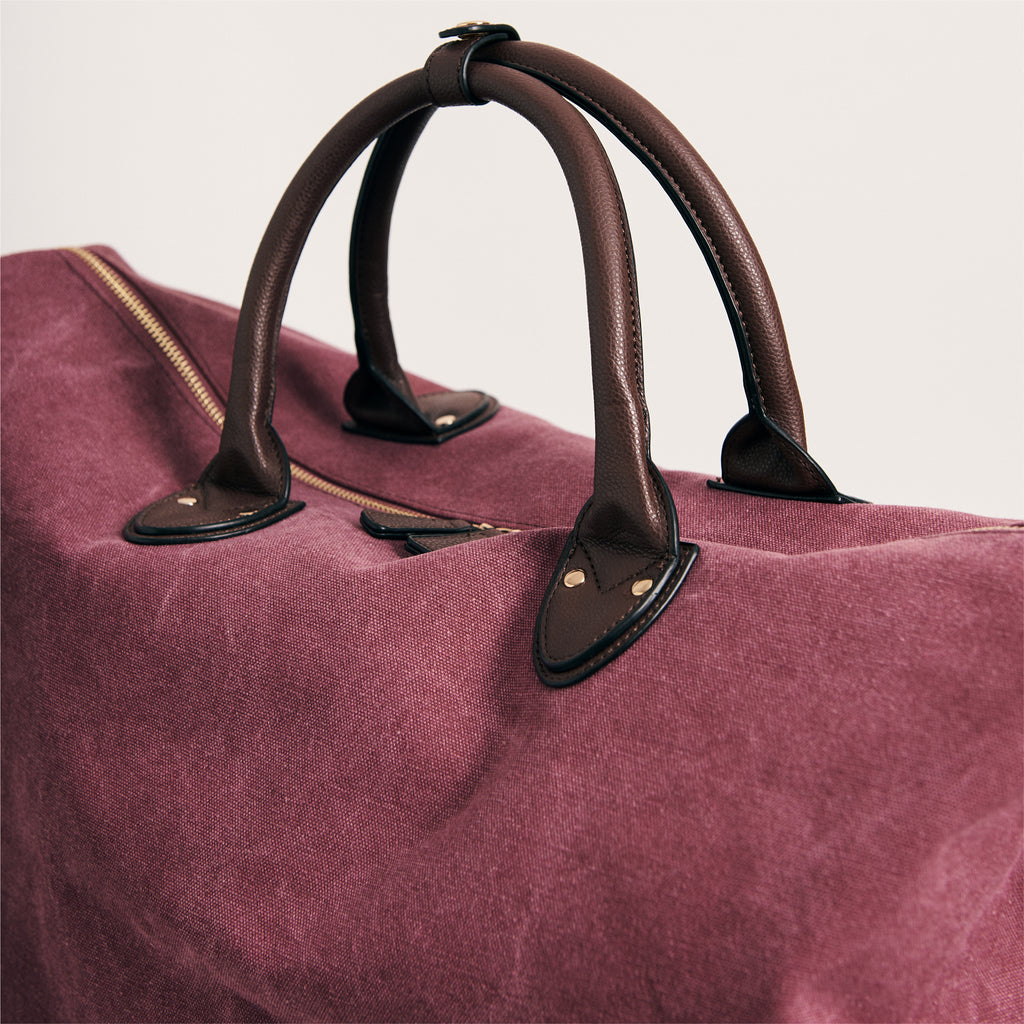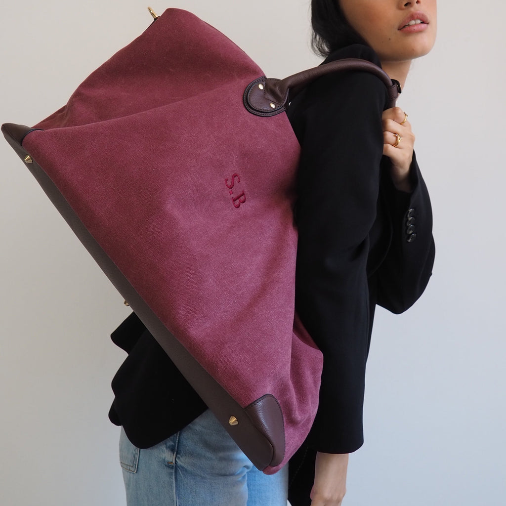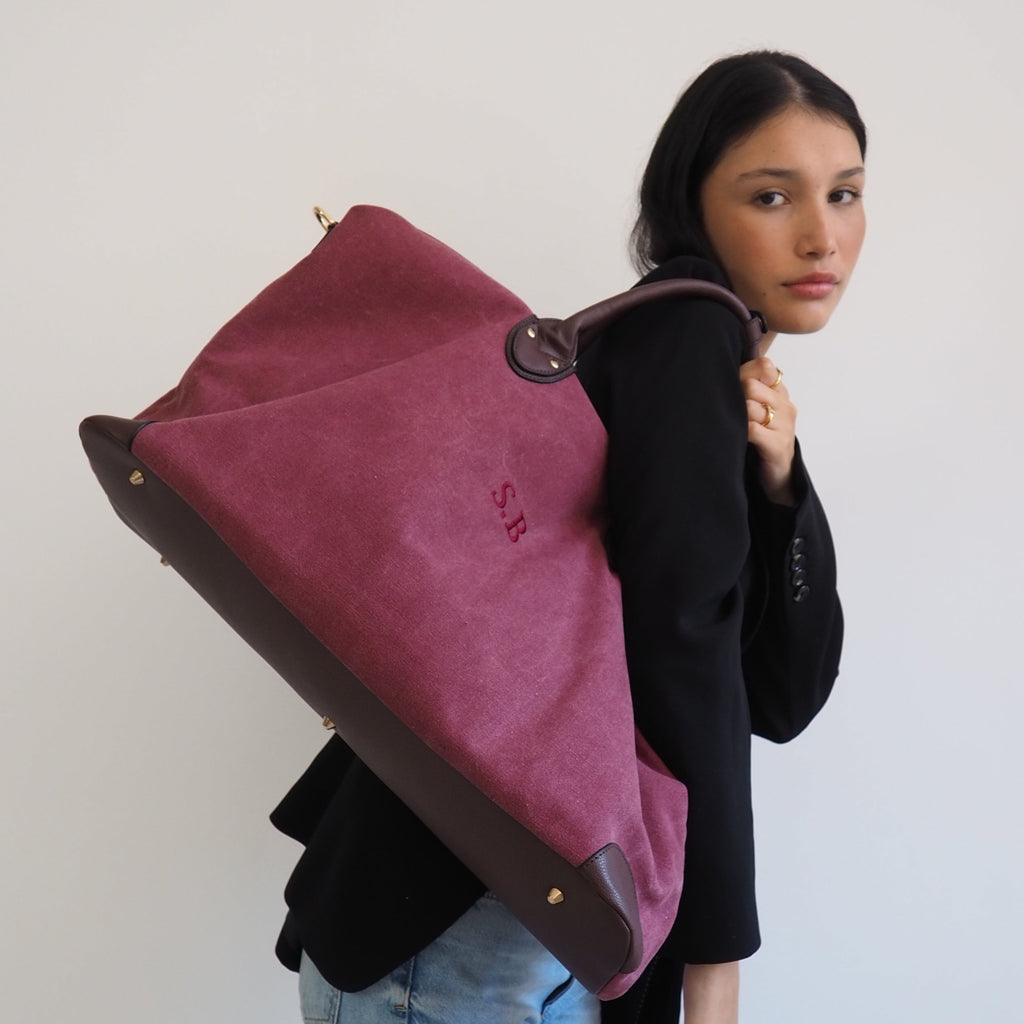 Bolsa de lona granate. Interior de algodón blanco roto, asas y detalles en polipiel marrón oscuro.