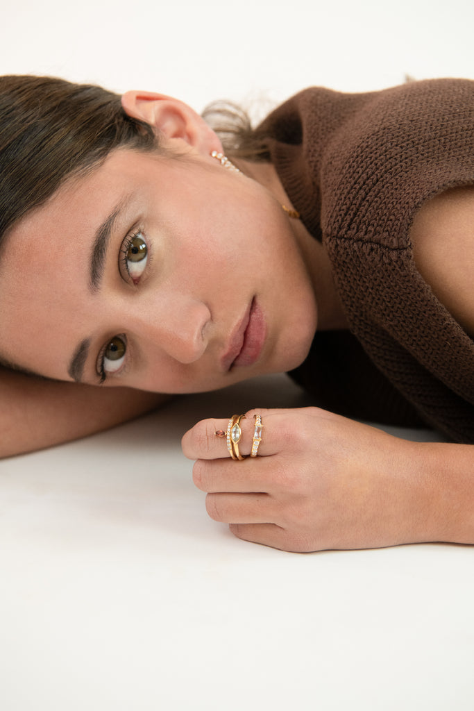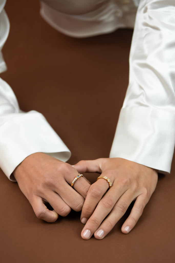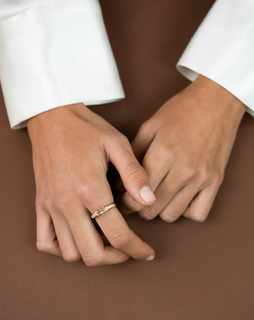 Anillo realizado en Plata de Ley 925 chapado en 3 micras en Oro de 18k. Un anillo básico para el día a día . Banda del anillo con ocho circonitas blancas y una central azul Topacio.