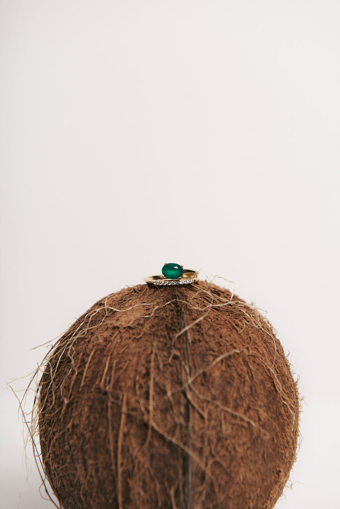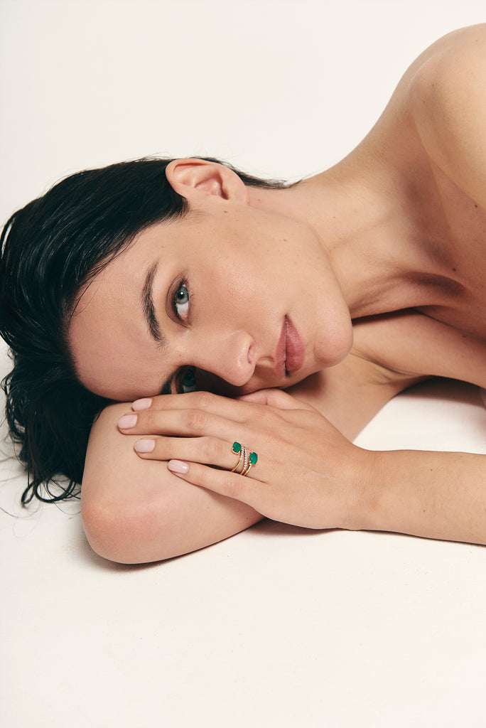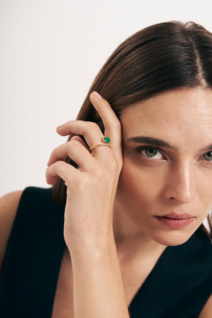Anillo realizado en Plata de Ley chapado en 3 micras en Oro de 18k y un Ágata verde como piedra central y protagonista de la pieza.
