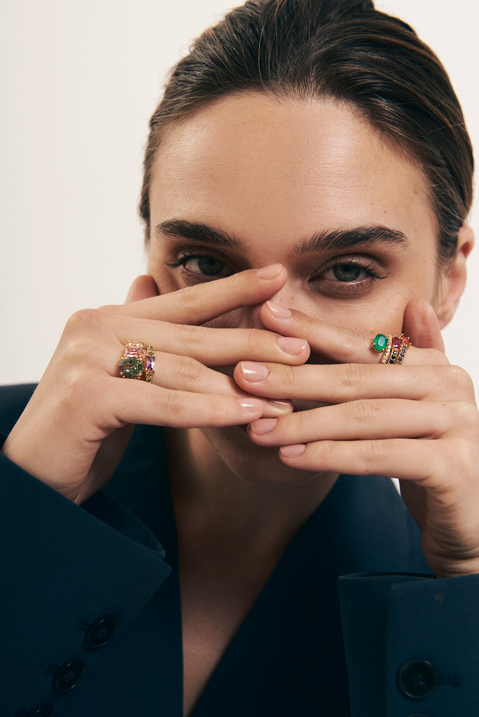 Una mezcla de colores y formas que forman una pieza única que te hará sentar única. ¡Combínalo con tus favoritos para que tus manos deslumbren!