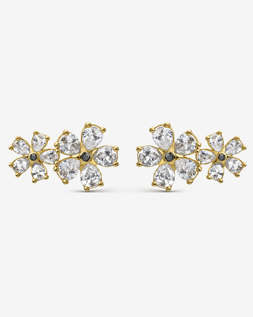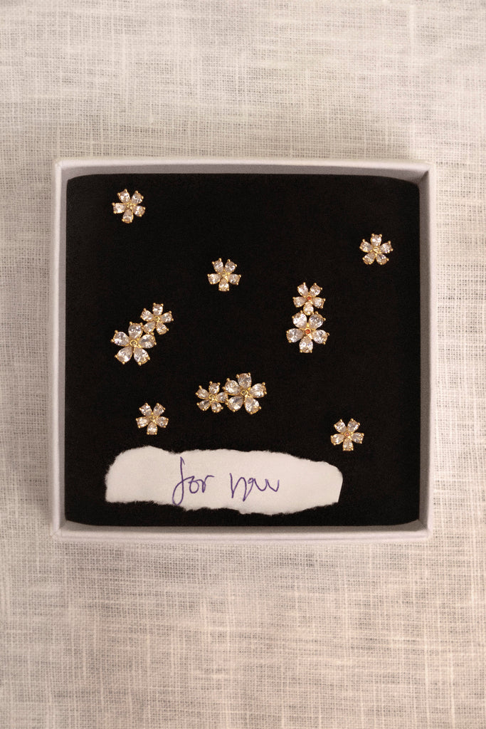 Cada flor, cuidadosamente elaborada en latón chapado en Oro de 18k, resplandece gracias a la sutil presencia de circonitas blancas que aportan un brillo refinado y con una piedra central de garnet granate o verde periodo, ofrece un toque de intensidad y sofisticación.