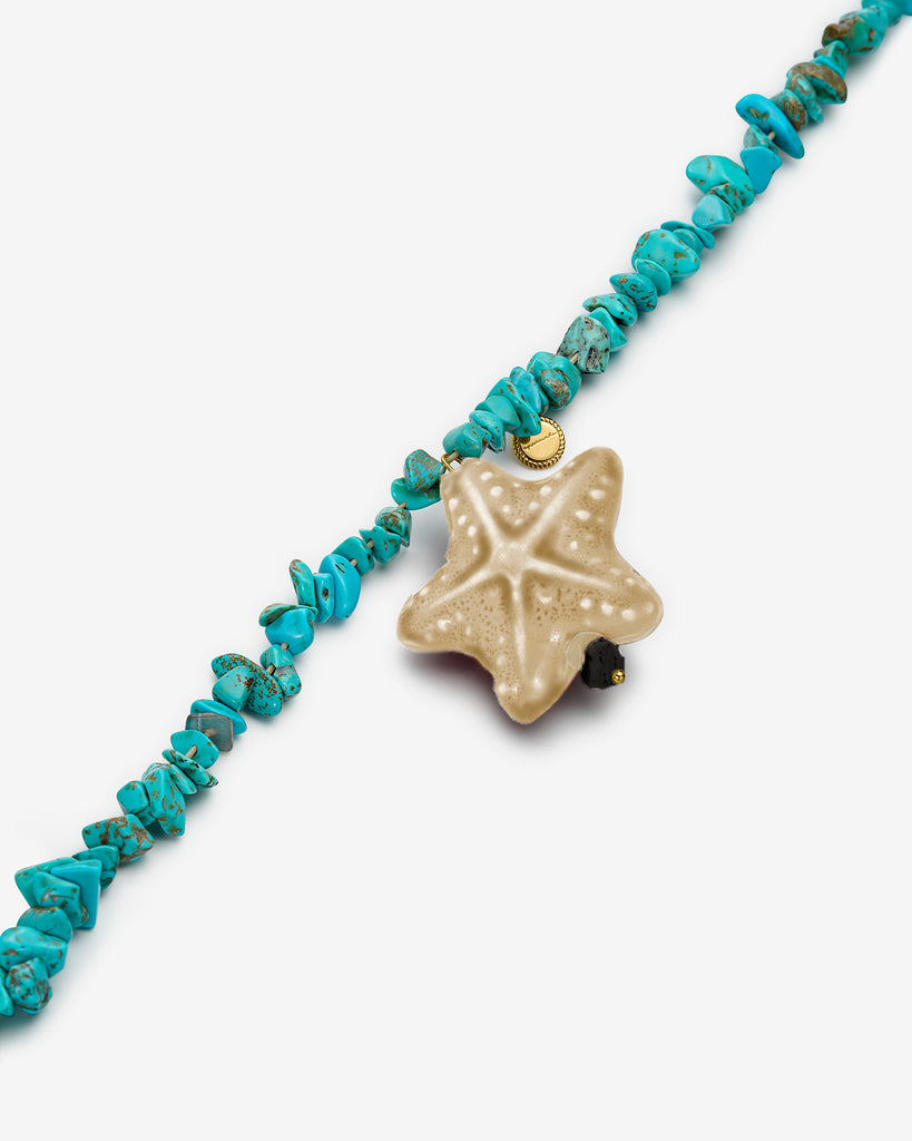 Colgante Mar con una estrella de cerámica. El cierre y la chapita de Latón bañado en Oro de 18 kts. Longitud de 80cm.