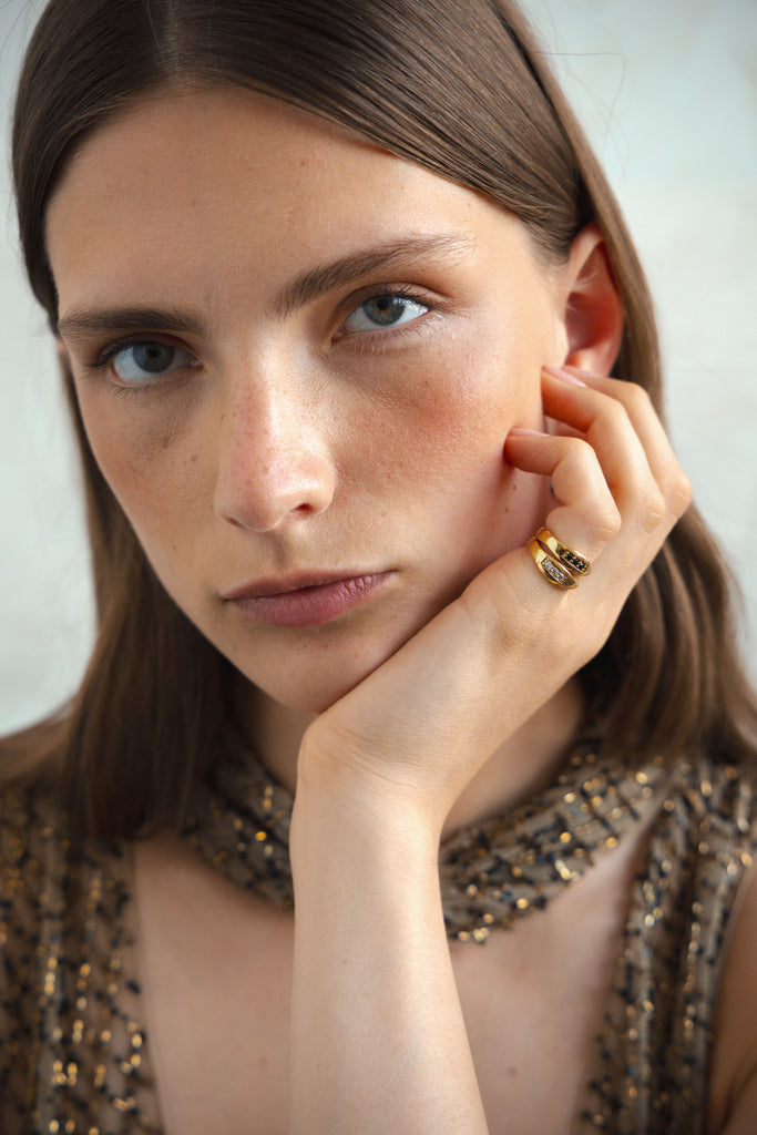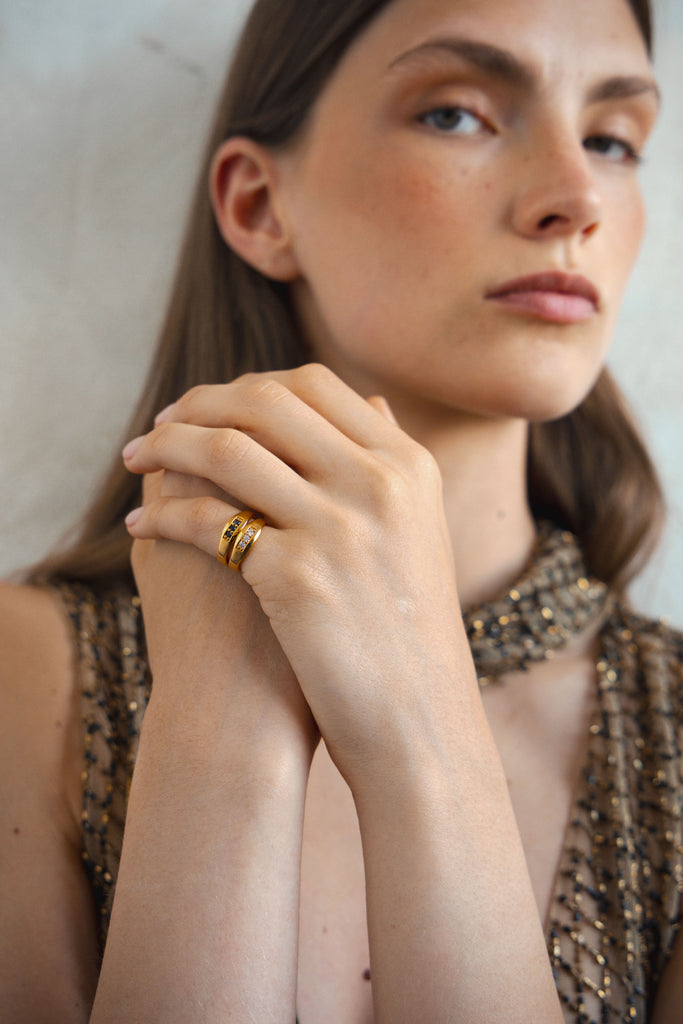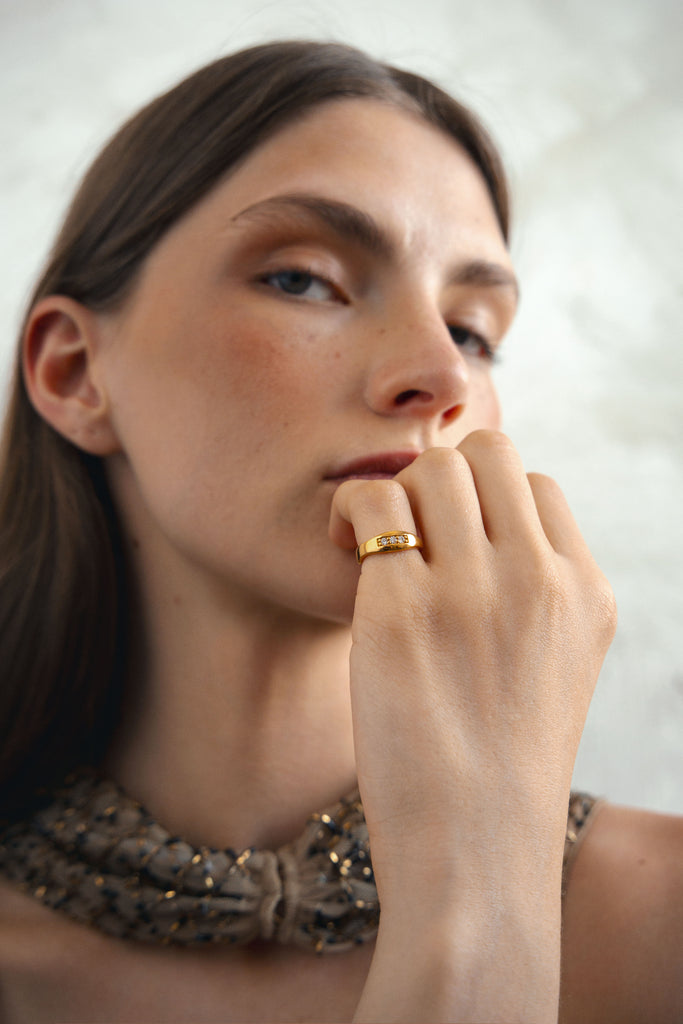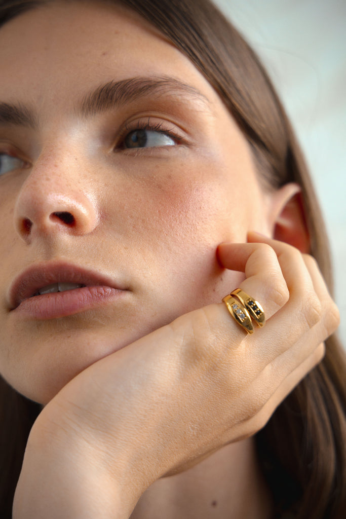 Anillo realizado en Latón bañado en Oro de 18k con un diseño irregular con tres circonitas blancas engastadas. Diseñado para el dedo meñique y disponible también en color negro.
