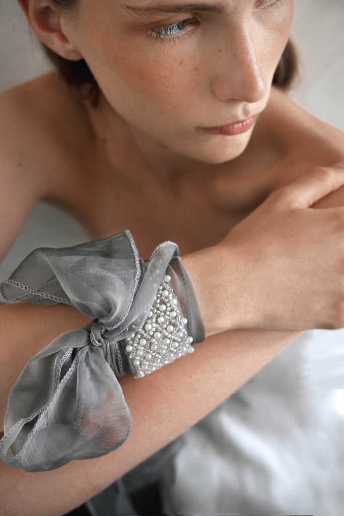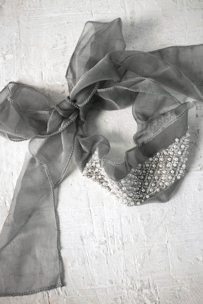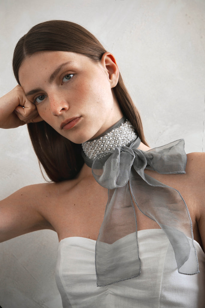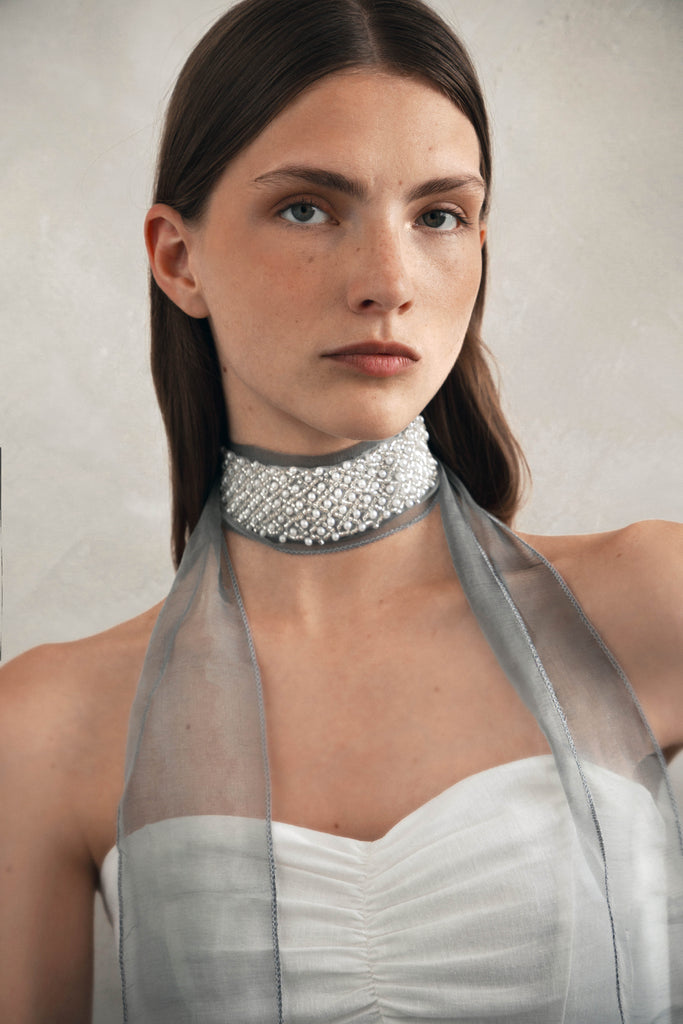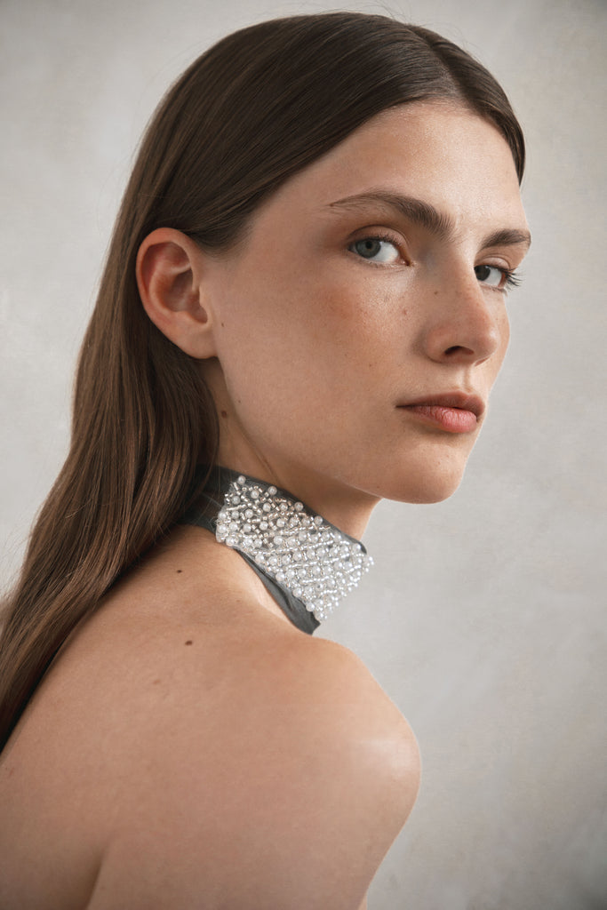 Collar tipo choker de seda con aplicación de joyas bordado a mano. Cierre con lazada. Elaborado 100% en España.