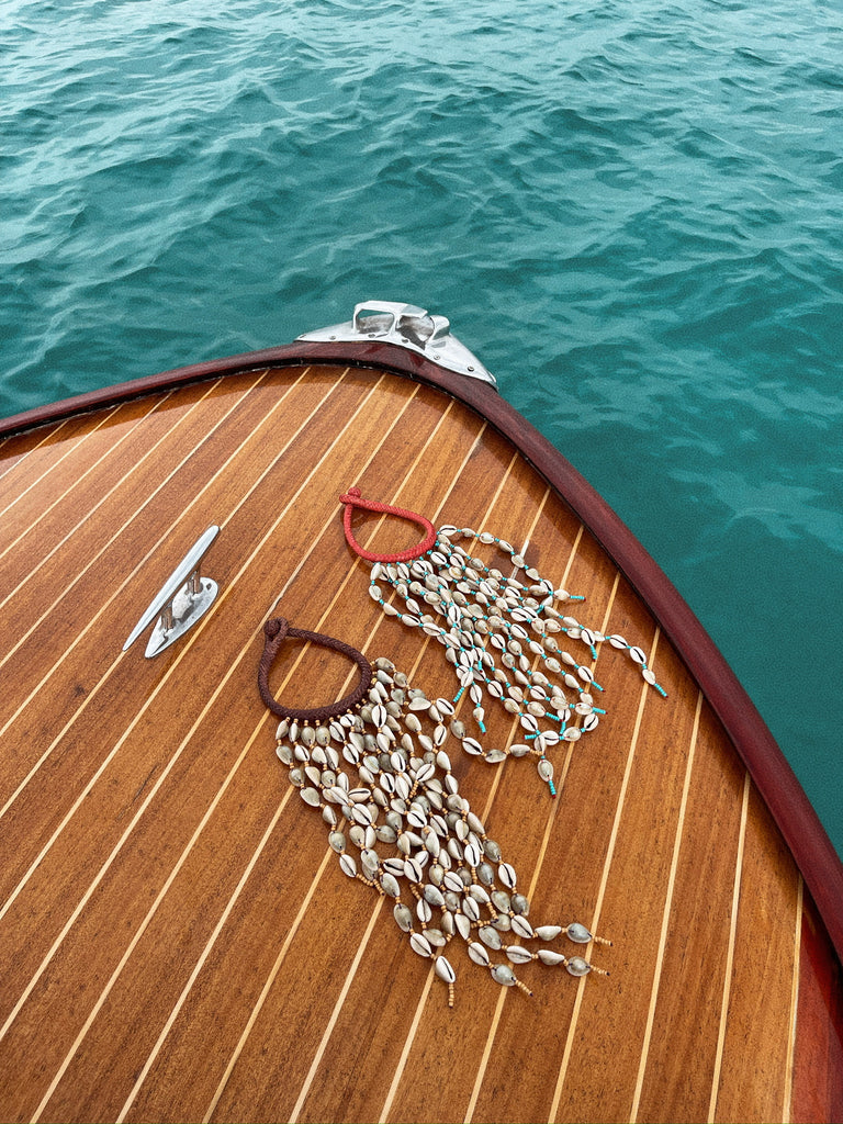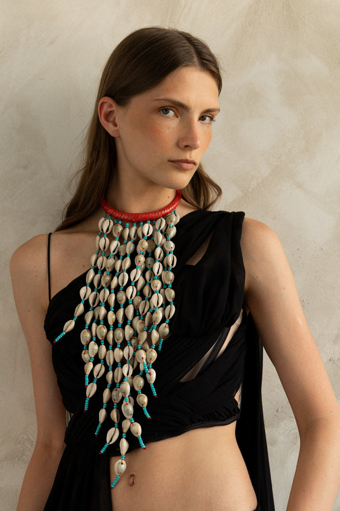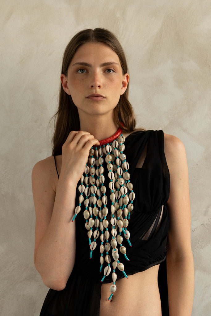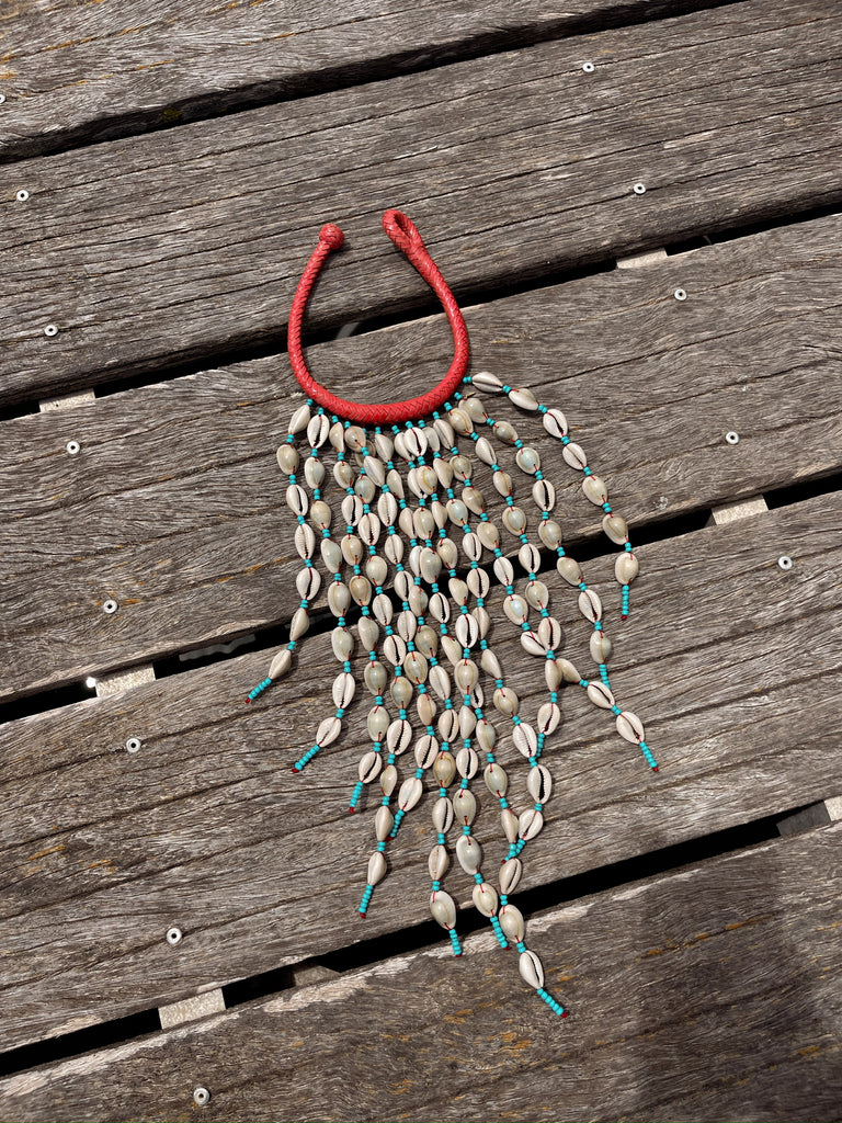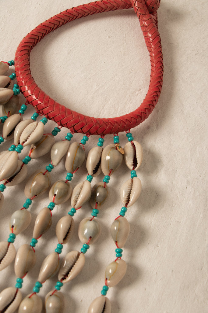 Inspirado en la calma del Mediterráneo y el ritmo suave de las olas, este colgante artesanal está compuesto por conchas naturales, cuentas turquesa y un cuello trenzado a mano en rojo coral. Una pieza llamativa y ligera, pensada para acompañarte en tus días de verano, desde la arena hasta una cena al atardecer. Cada diseño es único, como los tesoros que trae el mar.