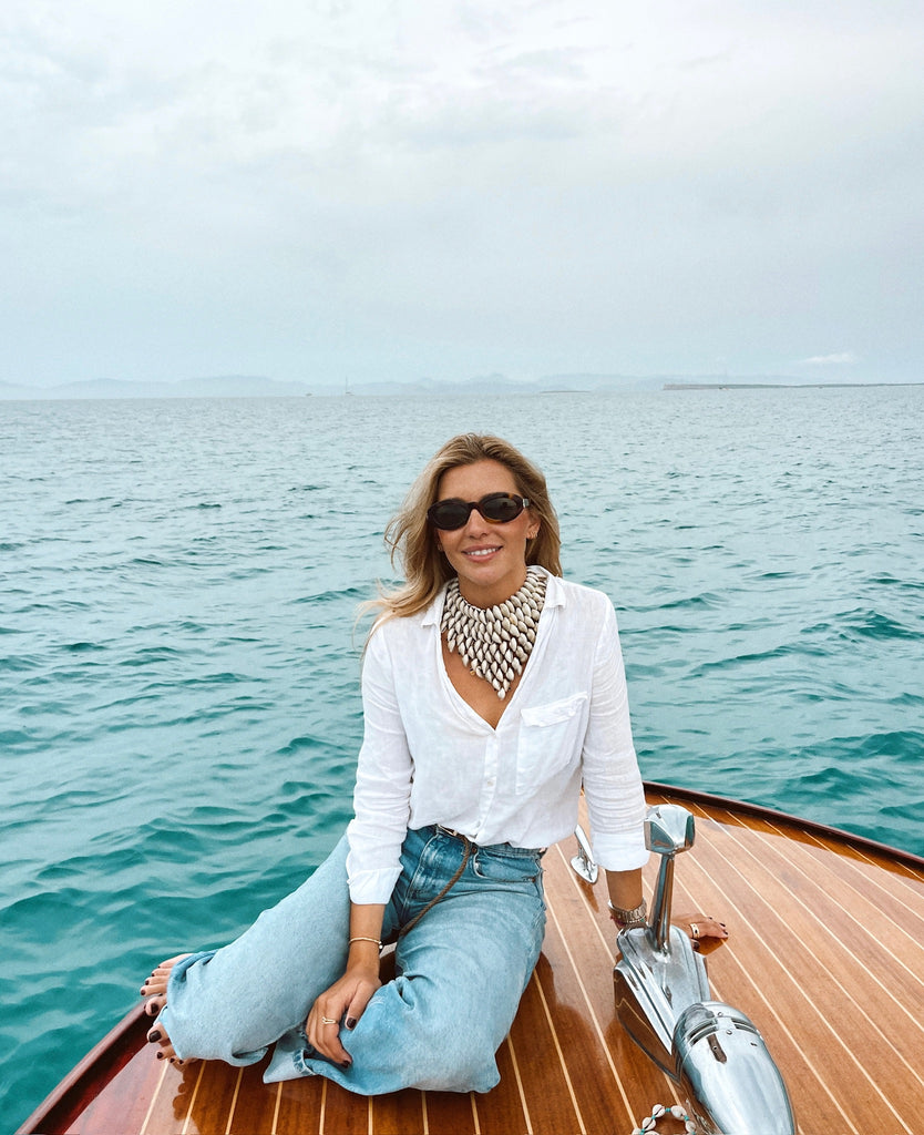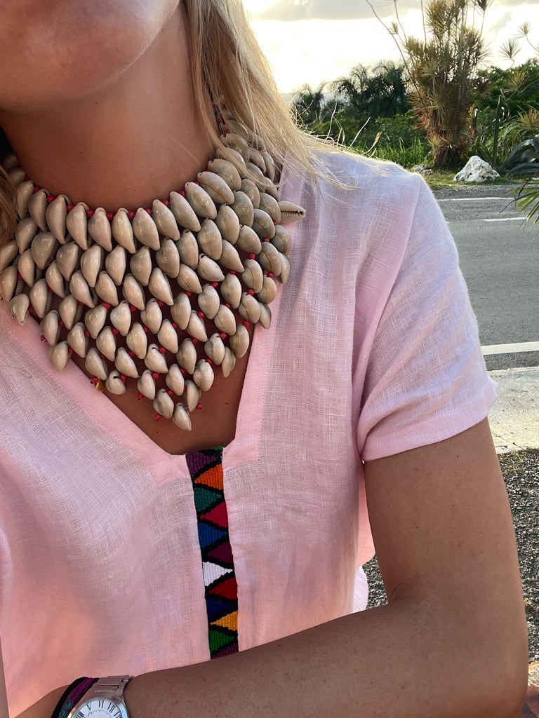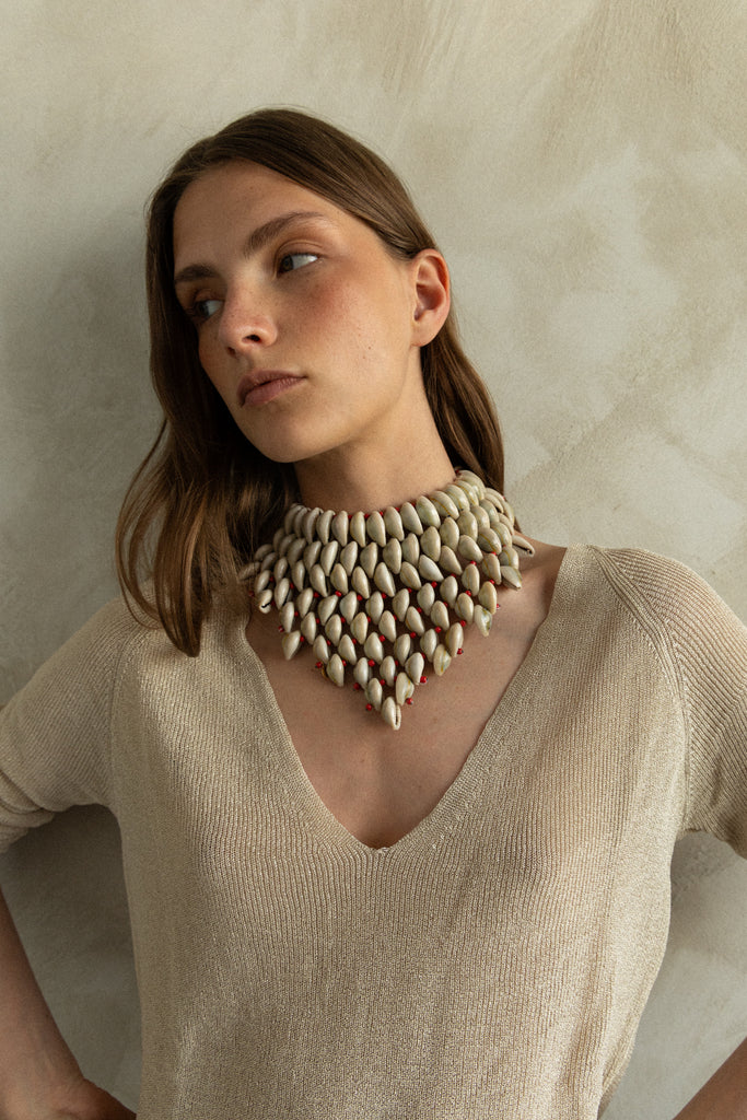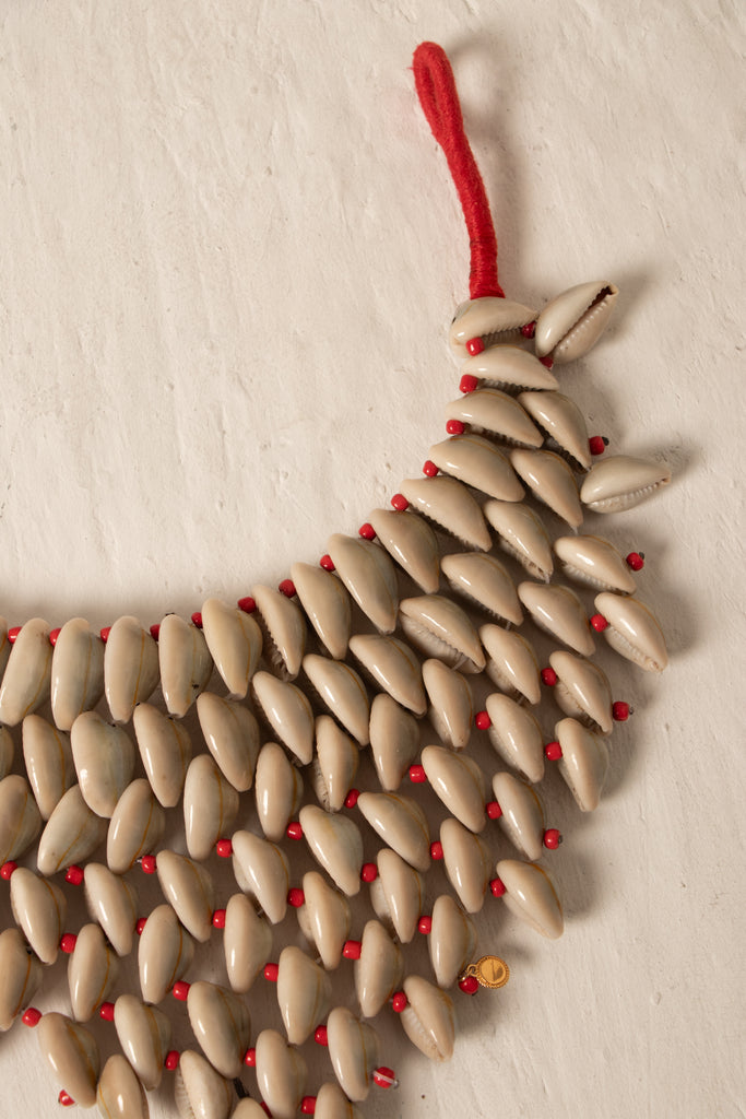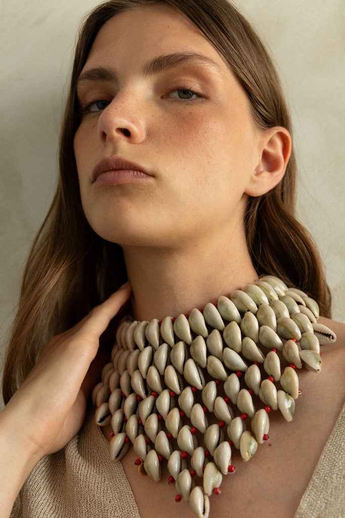 Este colgante artesanal está compuesto por conchas naturales cosidas a mano con hilo rojo, que también da forma a un cierre sencillo y cuentas rojas. Su silueta tipo gargantilla lo convierte en una pieza poderosa y envolvente, ideal para elevar cualquier look veraniego con un toque único.