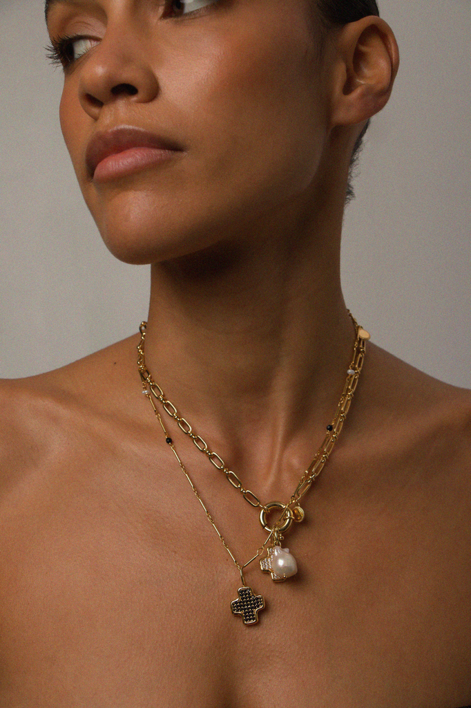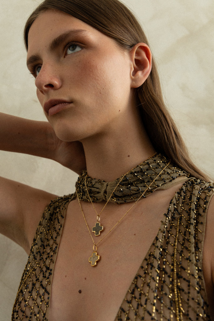 El Colgante Celine es una expresión de elegancia clásica con un toque artesanal. Esta pieza destaca por su cruz esculpido y diseñado a mano. Cuidadosamente elaborada capturando la belleza de todos los detalles. Este colgante cuenta con cincuenta circonitas blancas talla brillante engastadas que añaden un delicado toque de luz, y convirtiéndolo en una joya atemporal y con un toque muy cool!