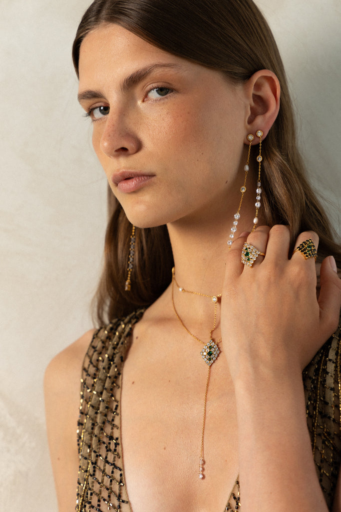El Colgante Coco es una joya que combina geometría y elegancia en un diseño muy especial. Su estructura triangular se compone de una fina cadena doble adornada con detalles de circonitas en distintos tamaños y perlas naturales, que convergen en un centro protagonista de inspiración vintage con circonitas de color verde esmeralda. Disponible en blanco y en negro, es perfecto para combinar con nuestro anillo Cosima.