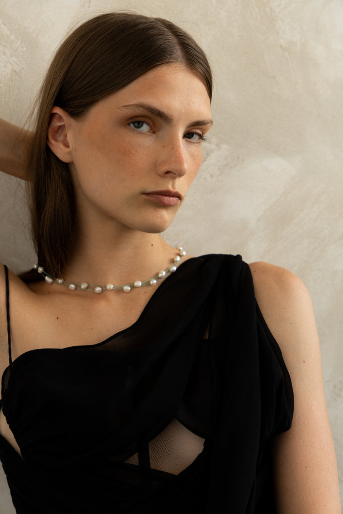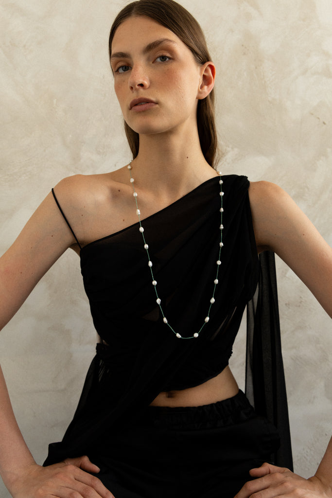 El Colgante Renata es una pieza fresca y delicada que combina artesanía y elegancia. Realizado en hilo de macramé color turquesa con lúrex, su textura suave y brillante se entrelaza con perlas distribuidas a lo largo del diseño, aportando un contraste sutil y sofisticado.