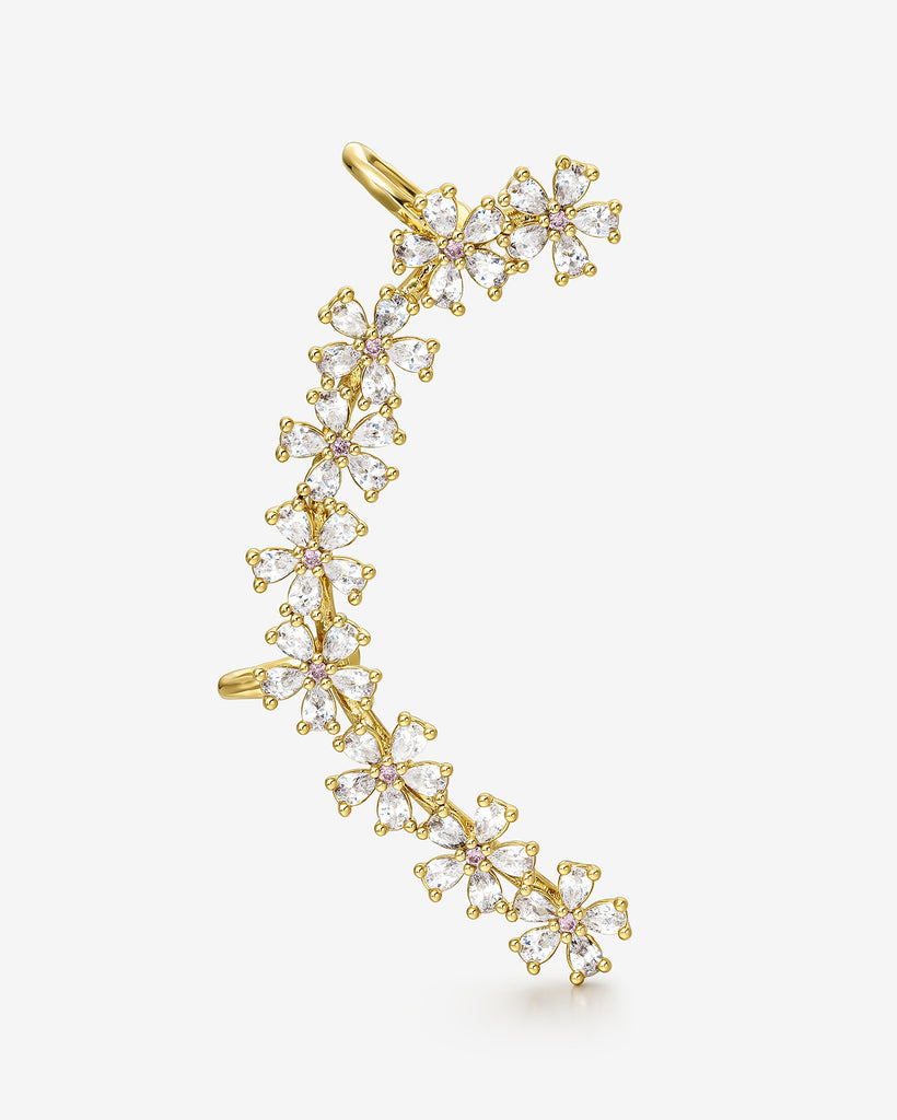 El diseño de flores que ascienden por la oreja está adornado con circonitas blancas que aportan brillo sutil, mientras que una circonita rosa palo central añade un toque delicado y femenino. Ve vende de manera individual.