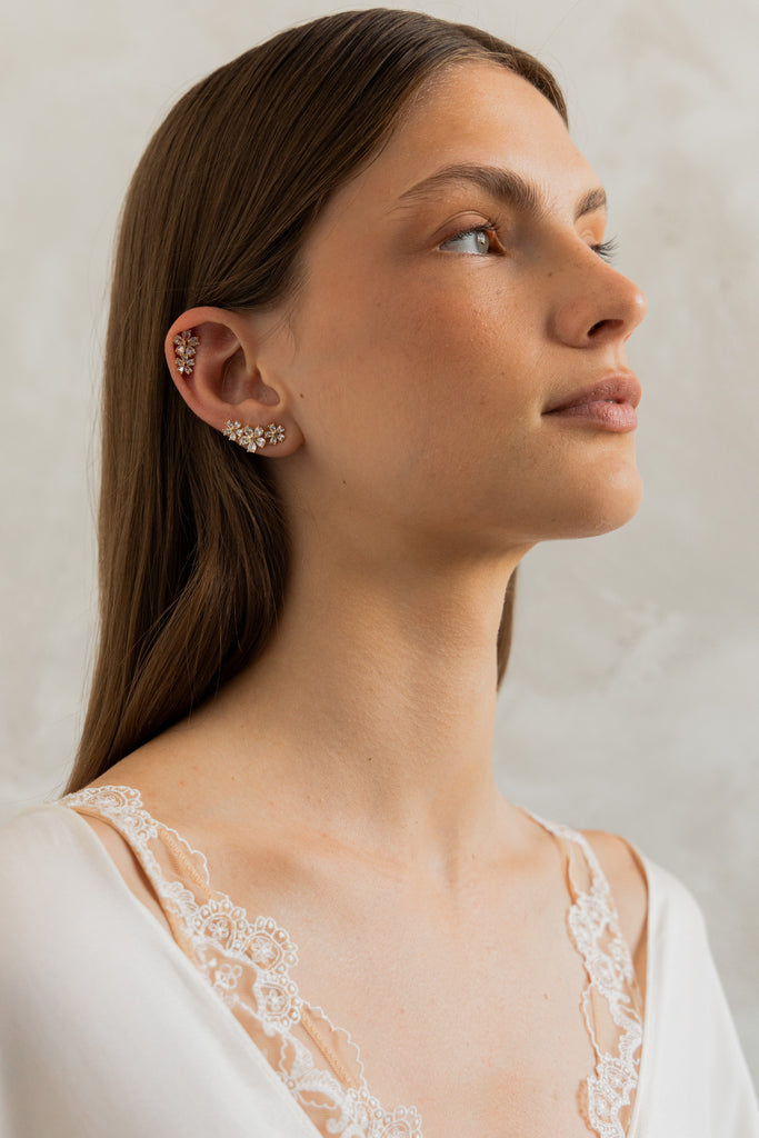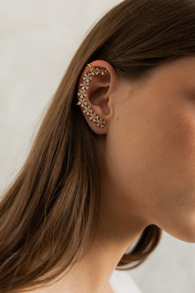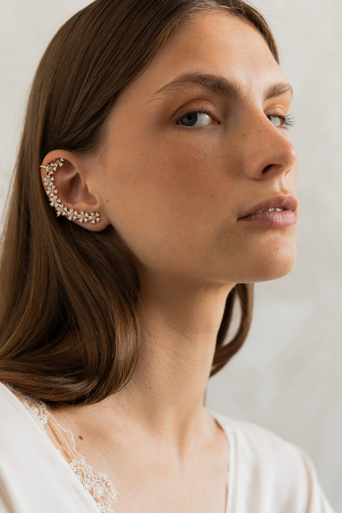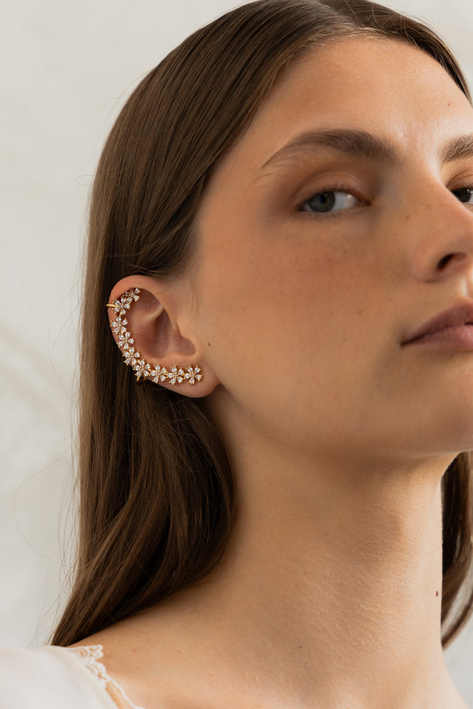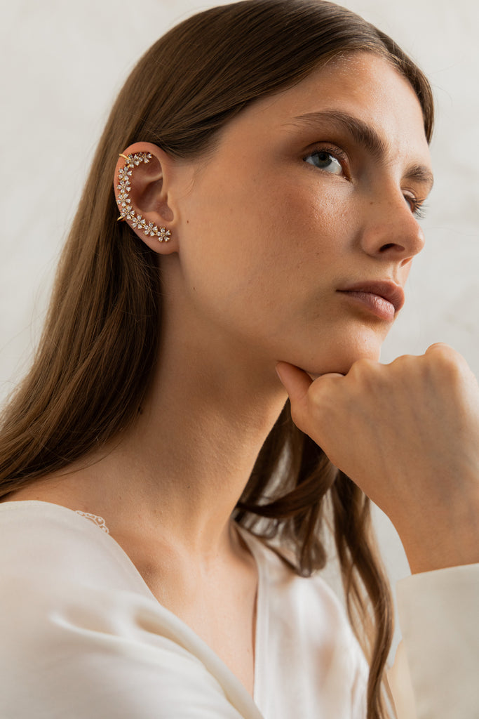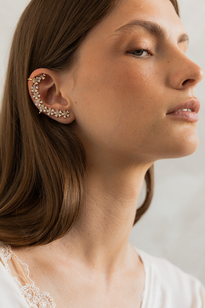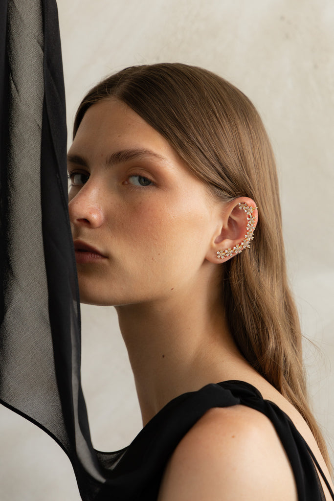 Diseño: Floral, con doble soporte earcuff y cierre con tuerca a presión.