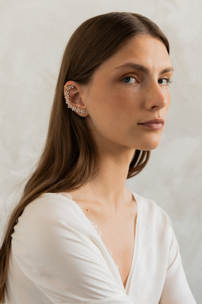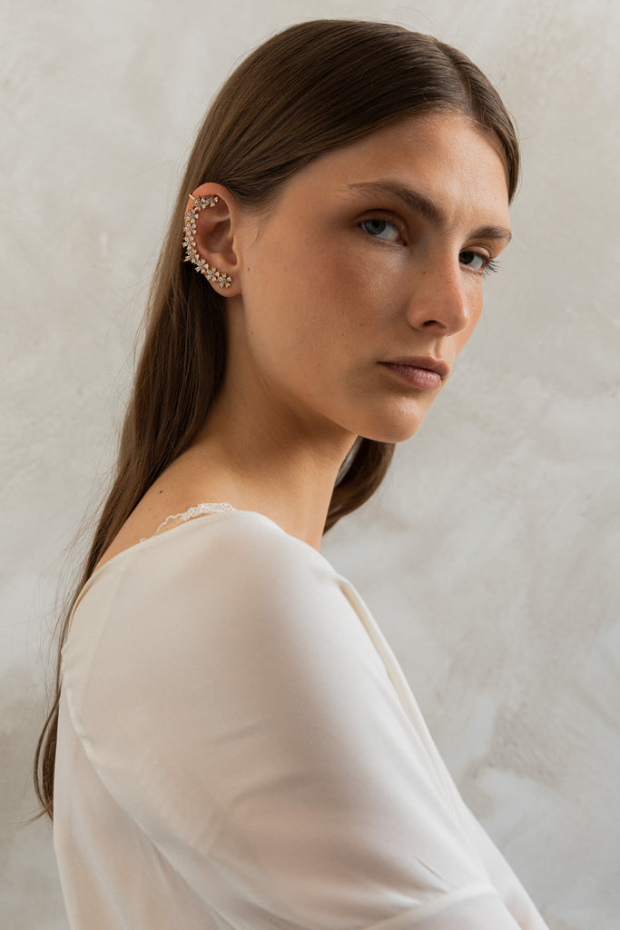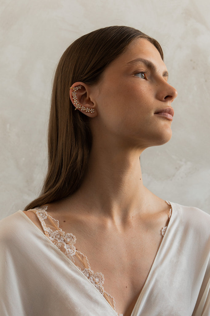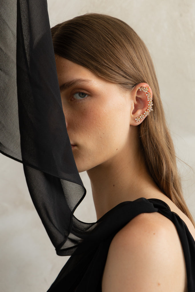 El Earcuff Leandra es una pieza única. Un pendiente trepador que combina exclusividad y elegancia. Su estructura se ajusta fácilmente a lo largo de la oreja gracias a sus dos soportes y cierre con tuerca a presión, proporcionando sujeción segura y mucho estilo a partes iguales.