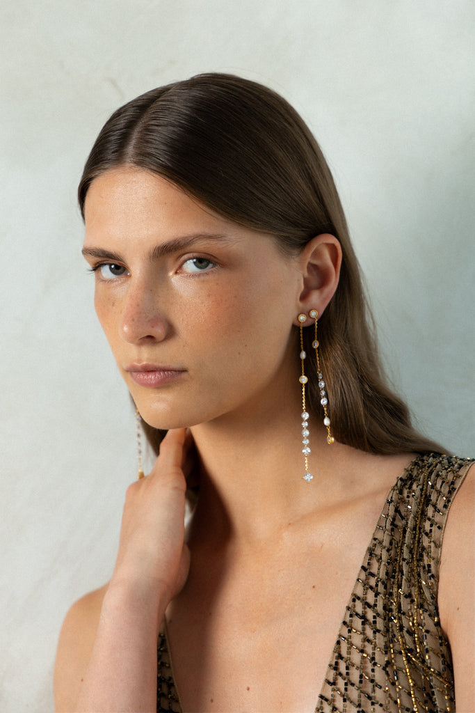 Los Pendientes Cova destacan por su diseño asimétrico y delicado que juega con la luz y el movimiento. Están compuestos por finas cadenas bañadas en Oro de 18k, decoradas con circonitas blancas de distintos tamaños y formas, combinadas con pequeñas perlas naturales.