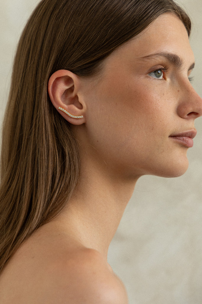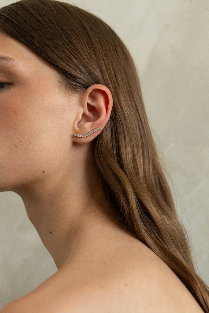 Los Pendientes Pipa son el toque perfecto de brillo sutil y estilo moderno. Su diseño tipo trepador se adapta a lo largo del lóbulo, decorando elegantemente la oreja con una línea de circonitas blancas que capturan la luz con cada movimiento.