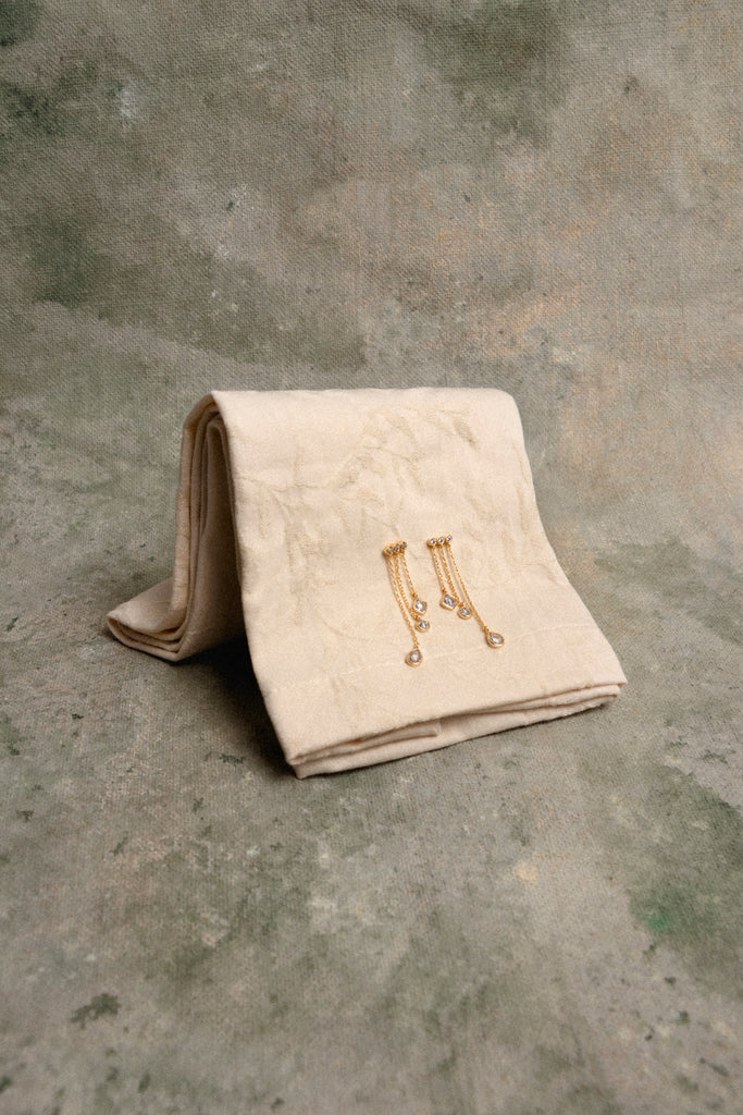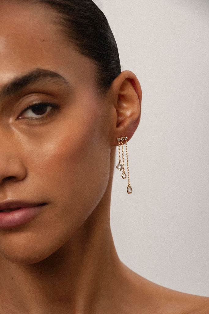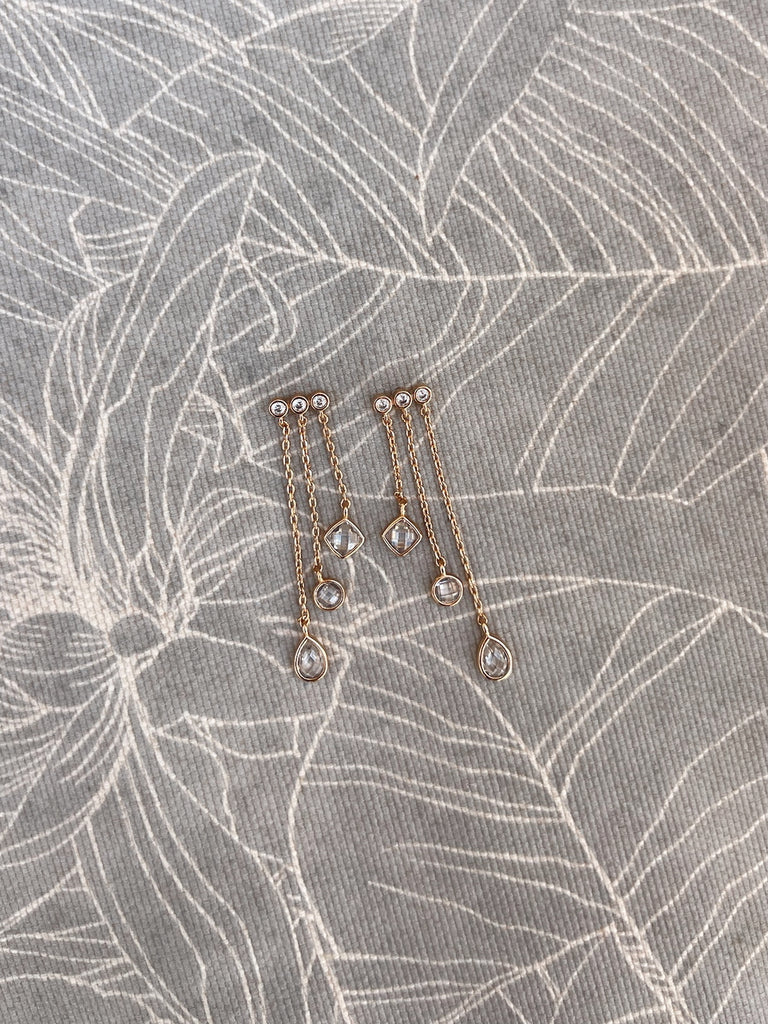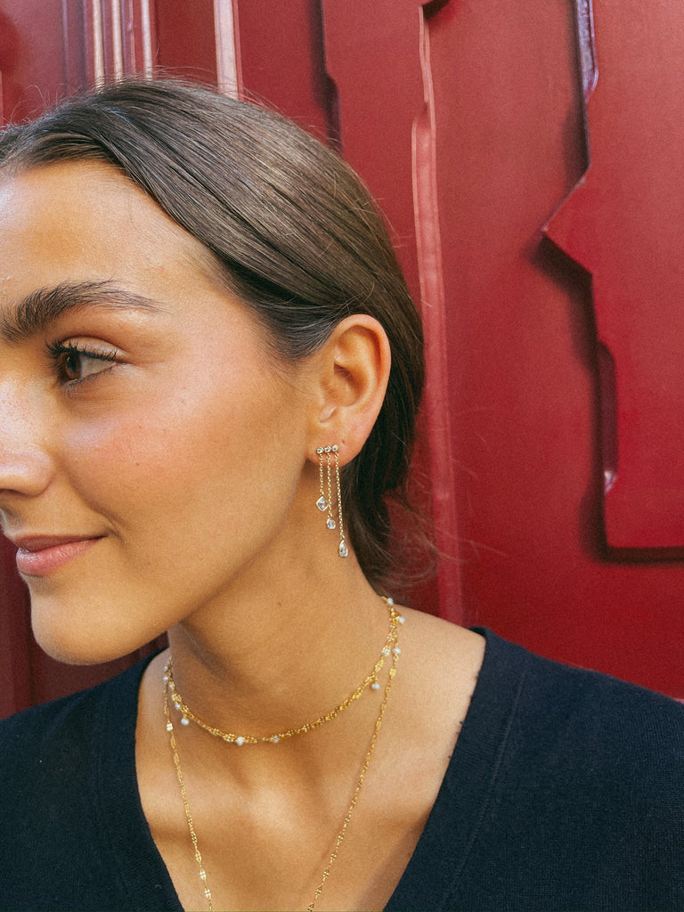 La joya de la corona se muestra ante nosotros en su forma más clásica y elegante. Como protagonista una silueta con tres circonitas regulares en la base y tres circonitas en el acabado de cada cadena, irregulares en el largo y en la talla de la piedra. Este diseño alcanza una armonía perfecta entre la mujer y la joya, convirtiéndose en una joya ideal para regalar.