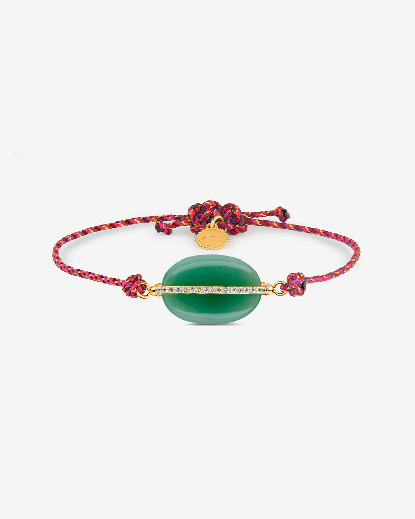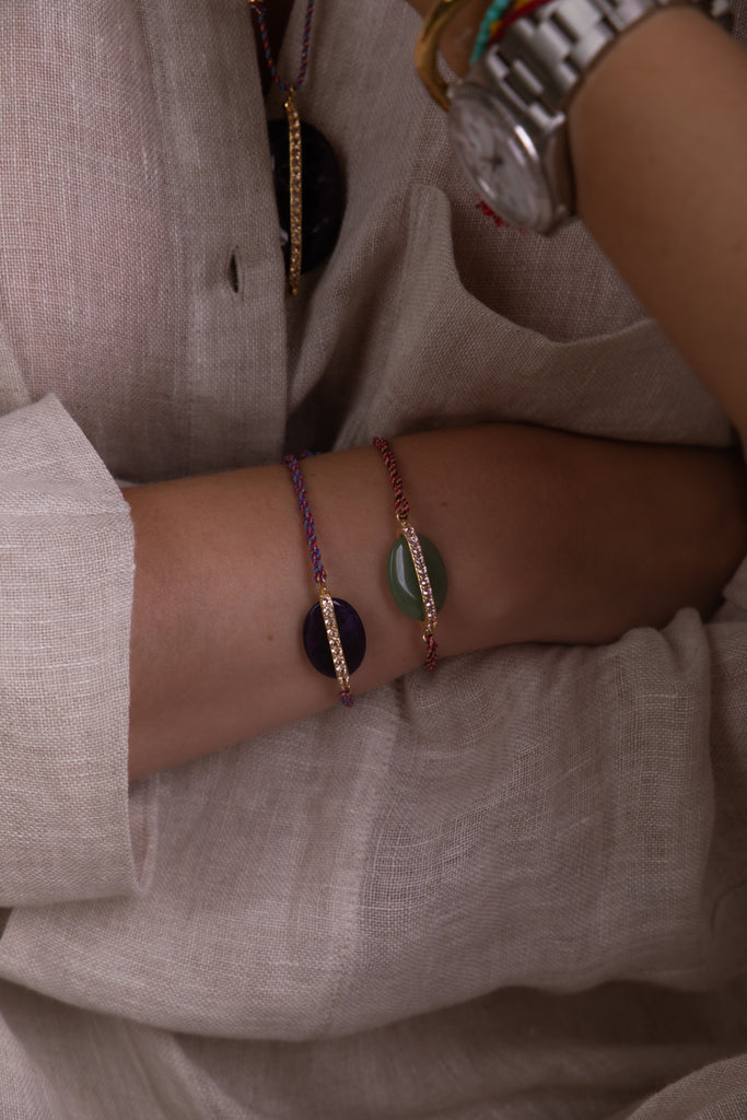 Este diseño tiene una gran piedra protagonista, Sodalita o Venturina rodeadas por unas circonitas pavé y un cordón multicolor con nudo corredizo.
