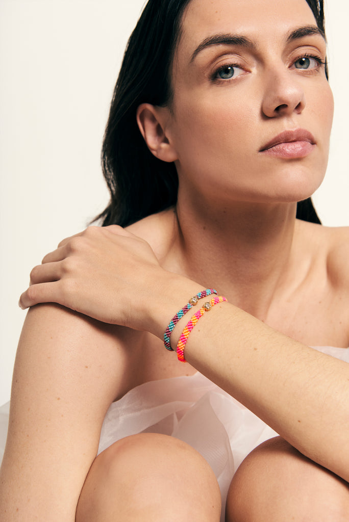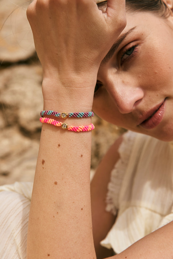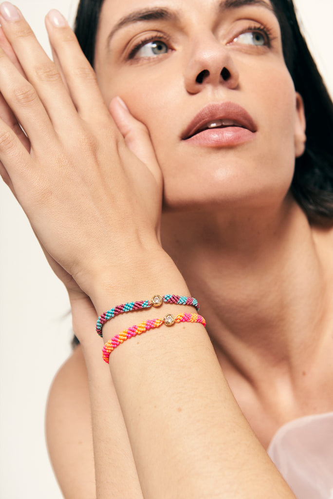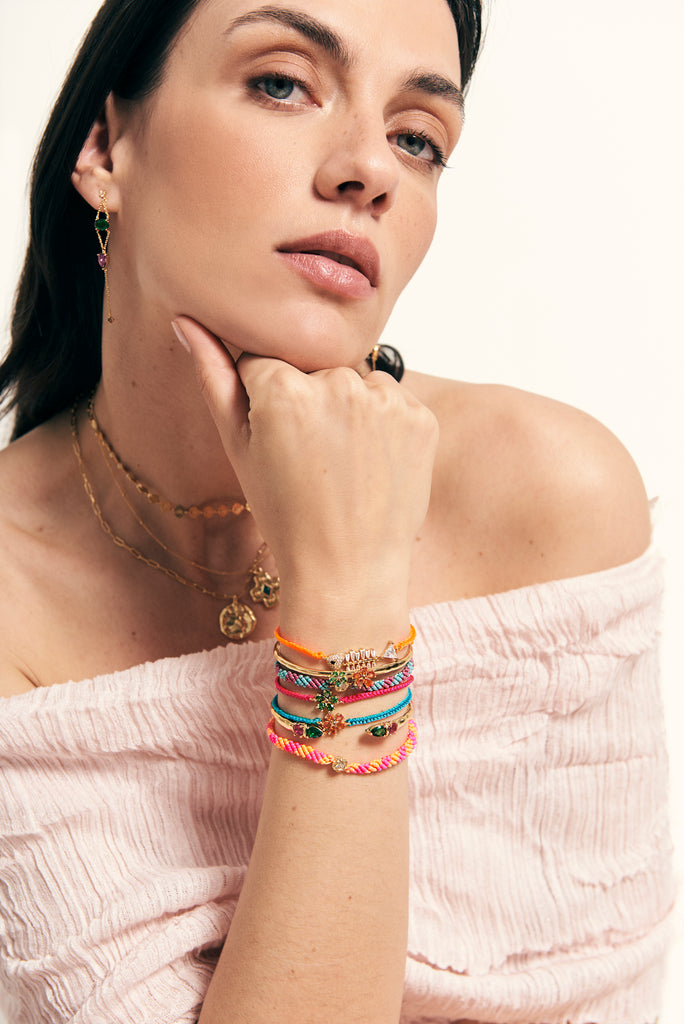 Pulsera realizada en Plata de Ley 925 bañado en 2 micras en Oro de 18k. Con una circonita engastada a mano y el cordón en color flúor trenzado en macramé con un nudo corredizo.
