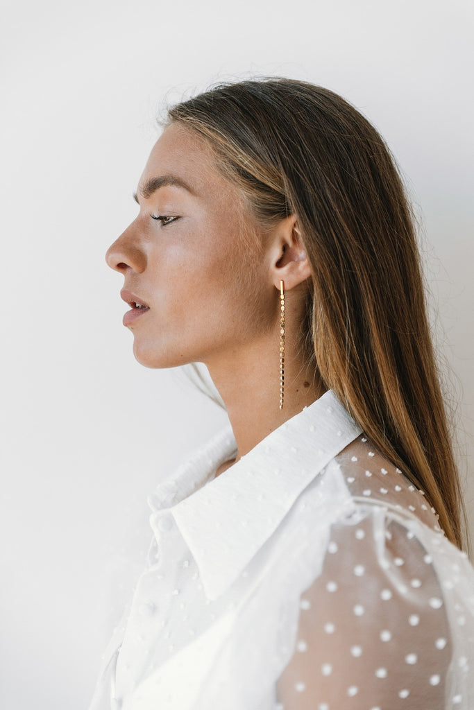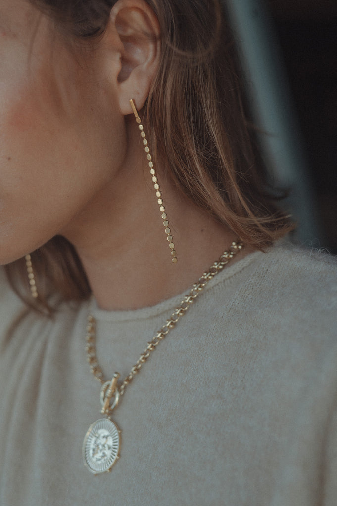 El diseño de este pendiente culmina con la caida de una cadena ligera de 8 cm, descendiendo con un movimiento único y juvenil. Cómodos, se convertirá en el accesorio atemporal y especial que aportará ese toque especial a cualquier look.