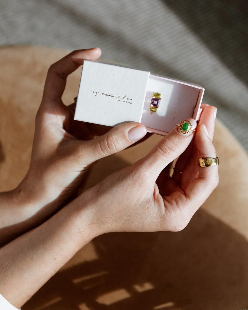 Fidelidad al estilo único e inconfundible de cada mujer, apasionada, valiente y dedicada. El anillo Antonella, con un diseño original e innovador, destaca por la combinación de piedras coloridas y refrescantes. Su diseño sofisticado lo convertirá en un favorito entre sus joyas, convirtiéndose así mismo en un accesorio ideal para regalar. Combinaciones de piedras: Amatista y Peridoto