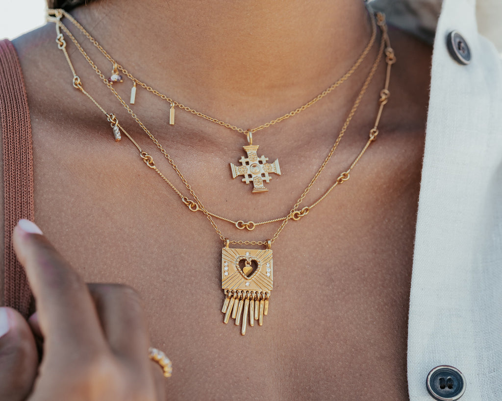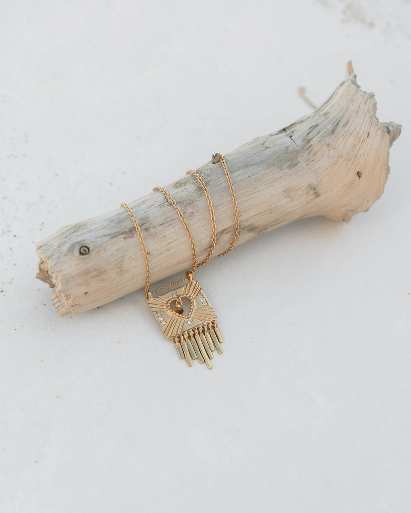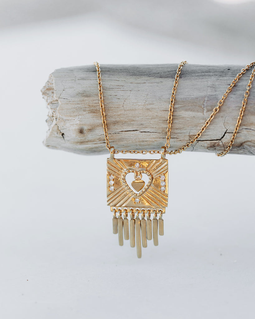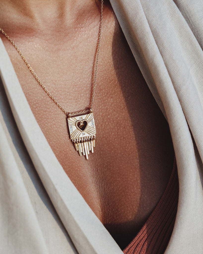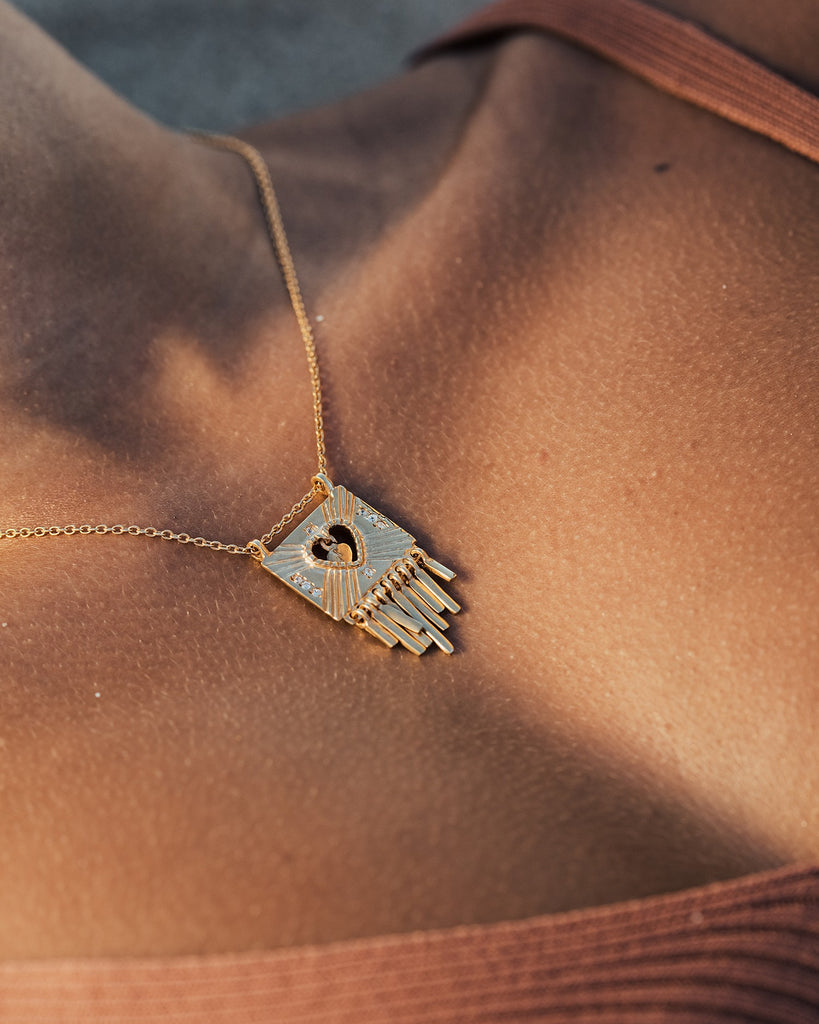 The heart, a symbol of life and inner strength, reappears in this amulet of love, luck and inspiration, with eight zircons set and nine sticks that with movement make it the jewel you need.