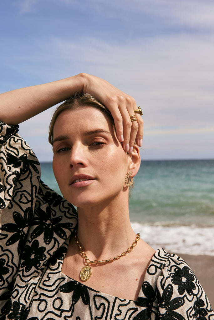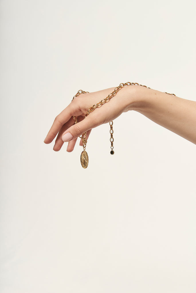 Pendant made of brass plated with 3 microns of 18 kt gold. Total length: 50 cm.