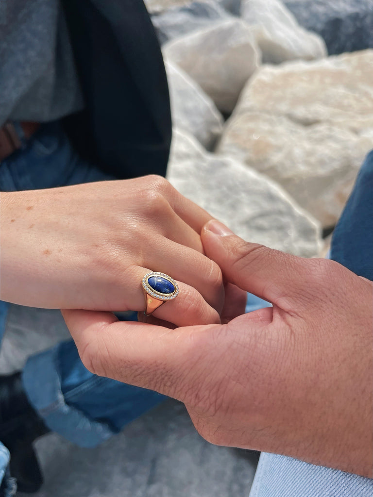 The ring you've been dreaming of, made of Sterling Silver plated with 3 microns of 18k Gold. A design that features its central stone as its protagonist. Available in Lapis Lazuli and Tiger's Eye, both surrounded by zircons.