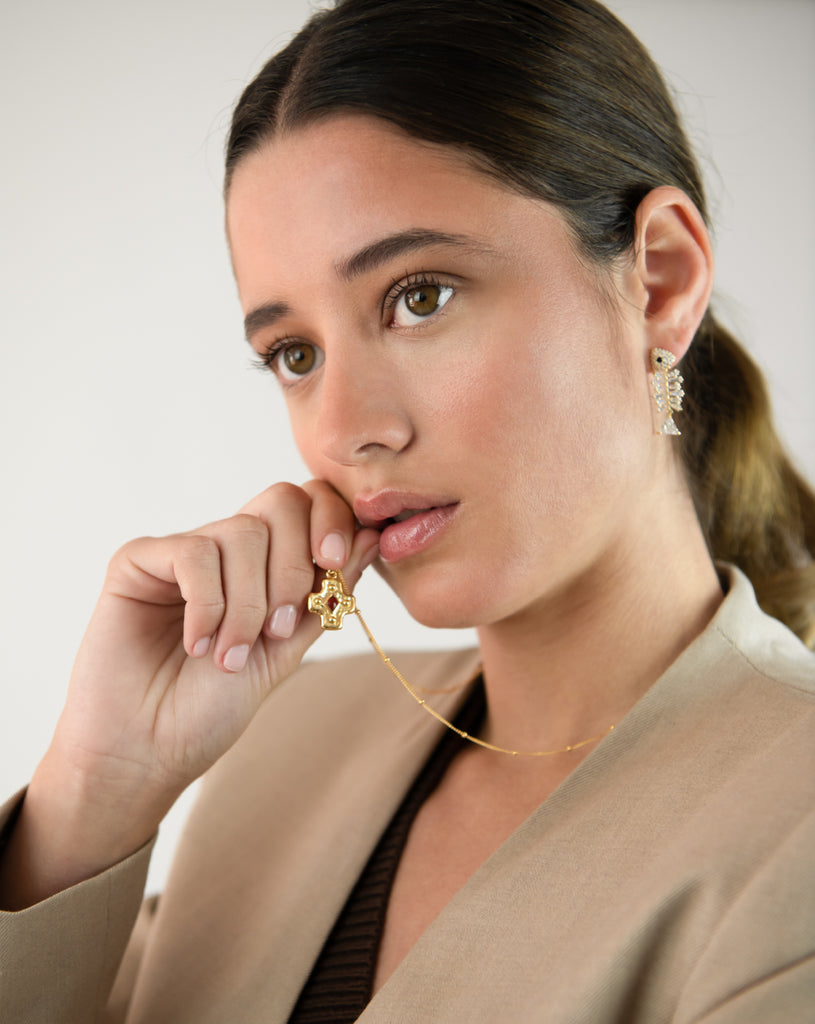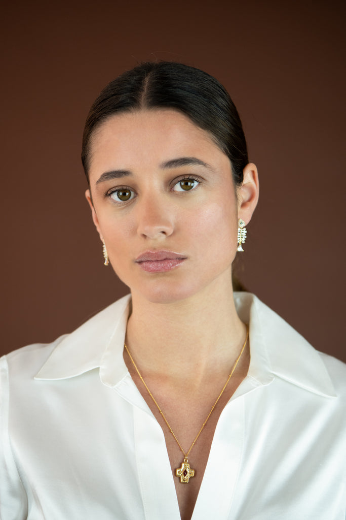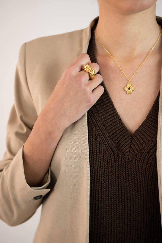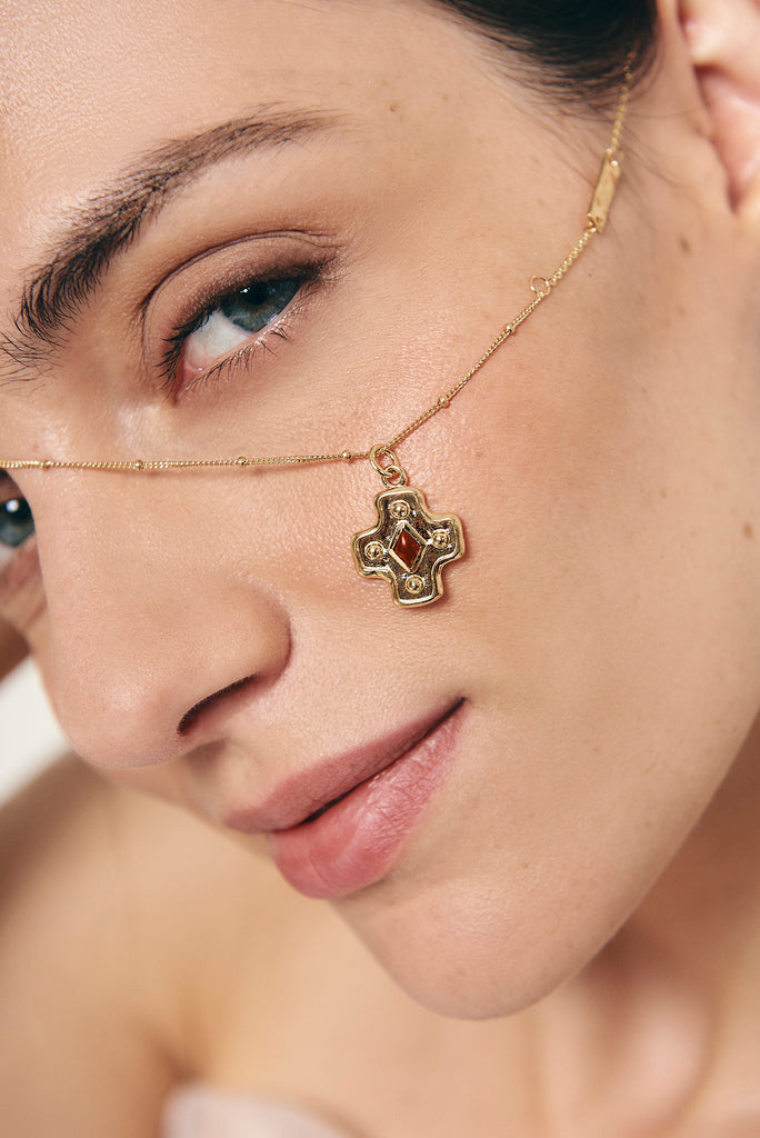 Colgante realizado en Plata de Ley 925 chapado en 3 micras en Oro de 18k. Diseño de una cruz tallada a mano con un Ágata en la parte central.