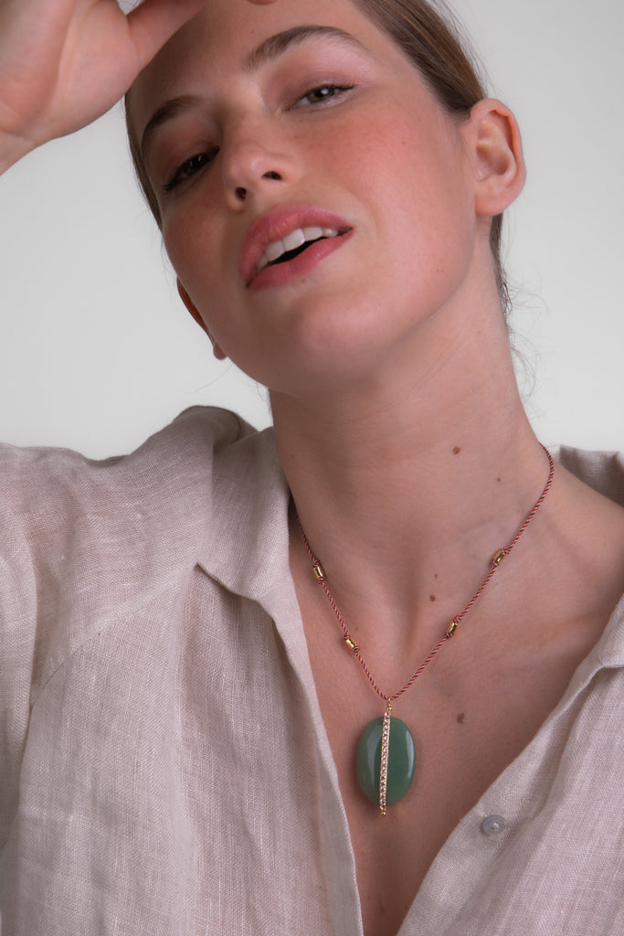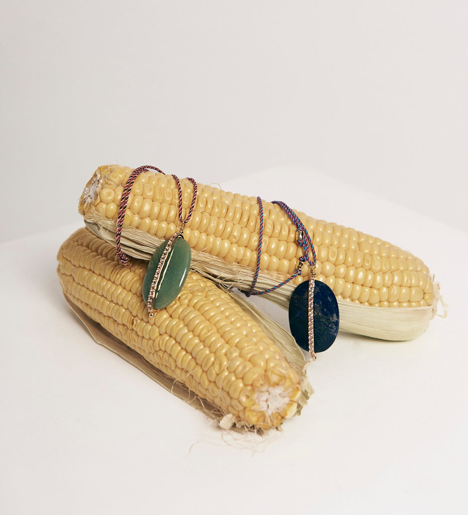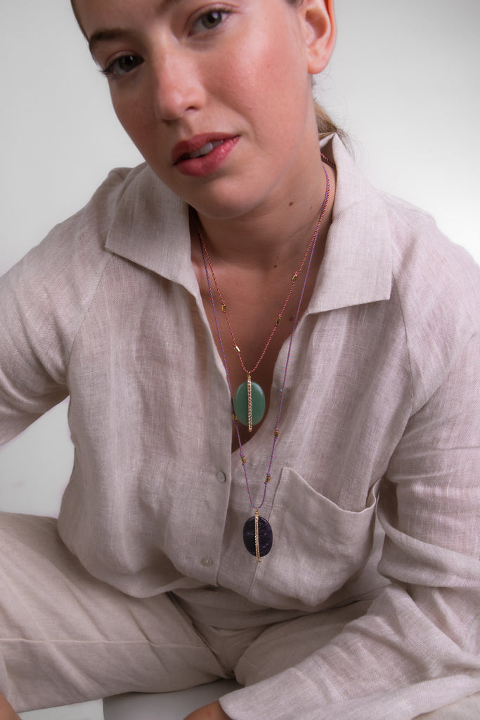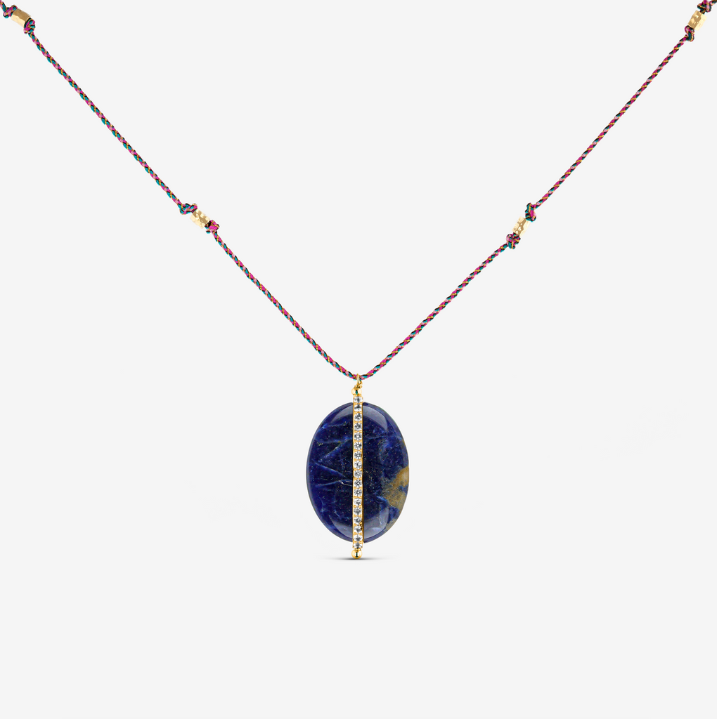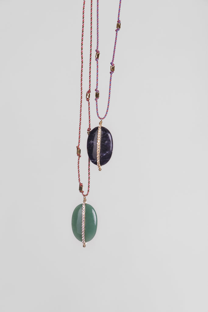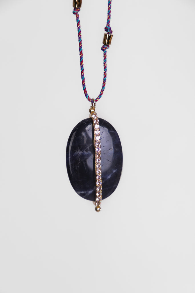 Este diseño tiene una gran piedra protagonista, Sodalita o Venturina rodeadas por unas circonitas pavé y un cordón multicolor con una longitud de 75 cm con nudo corredizo.