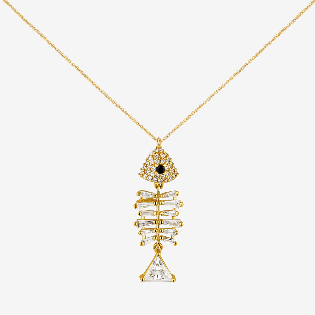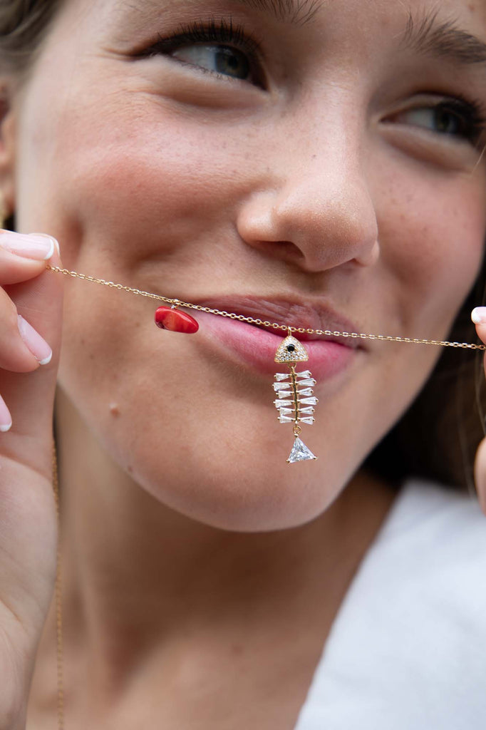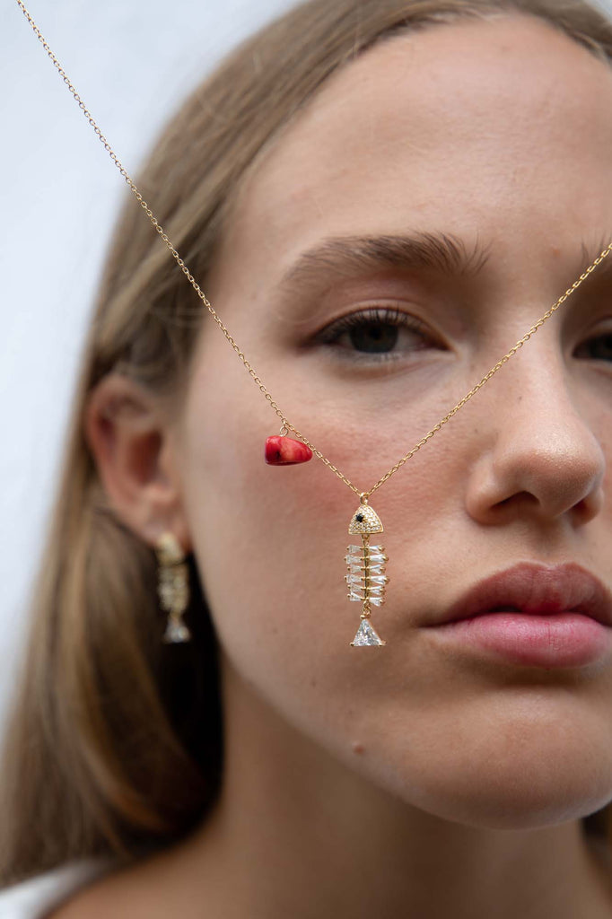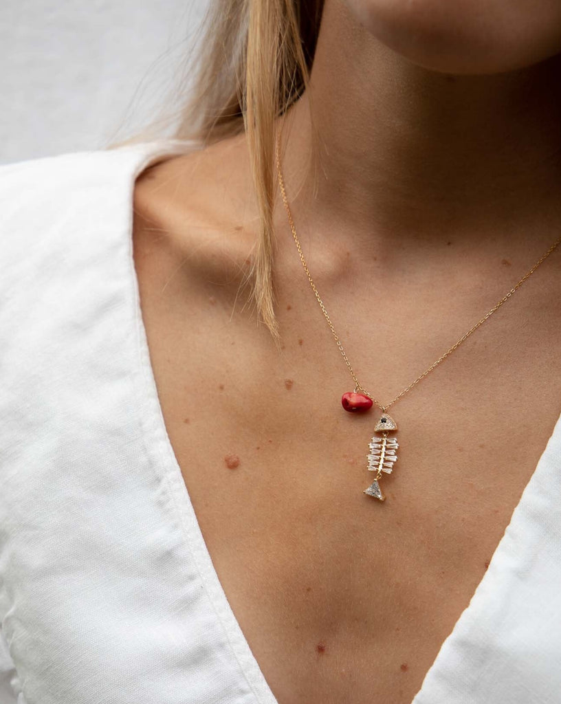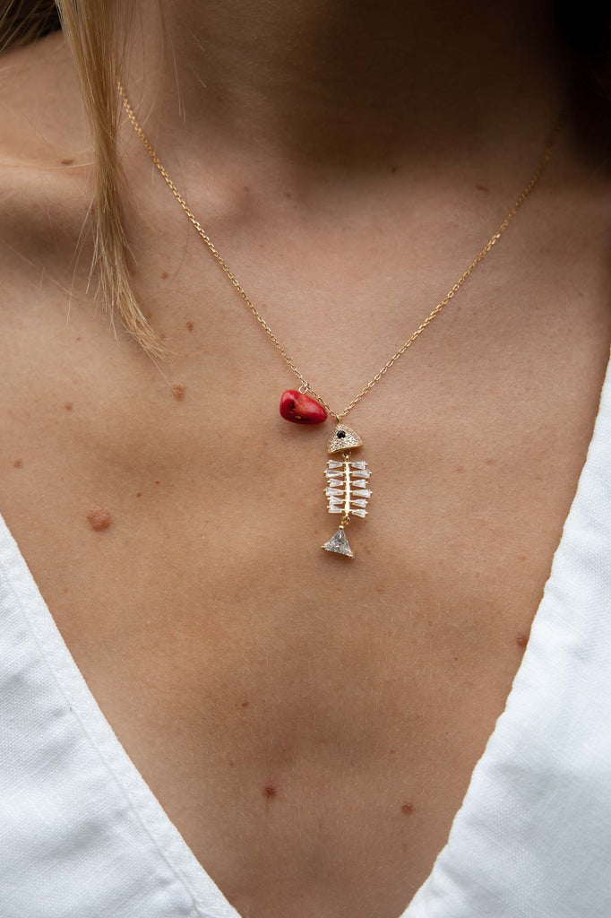 Diseño de nuestro icónico pez formado por 41 circonitas de diferentes tallas con un pieza de Coral natural colgando de la cadena.