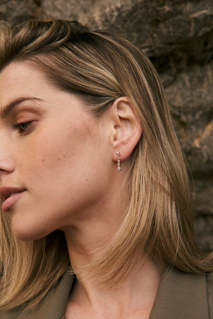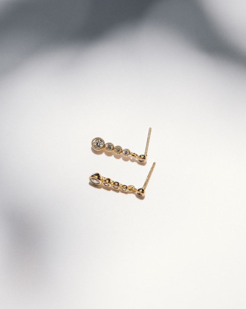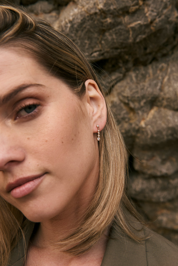 La elegancia de este diseño no dejará indiferente a ninguna mujer. Combinado con cinco circonitas de tamaño ascendiente, inspirados en las gotas de agua, sencillas en su composición pero incalculable en sentimiento. Estos pendientes atemporales se convertirá en el mejor aliado a la hora de hacer combinaciones sofisticadas, aportando ese toque de luz a tus looks.