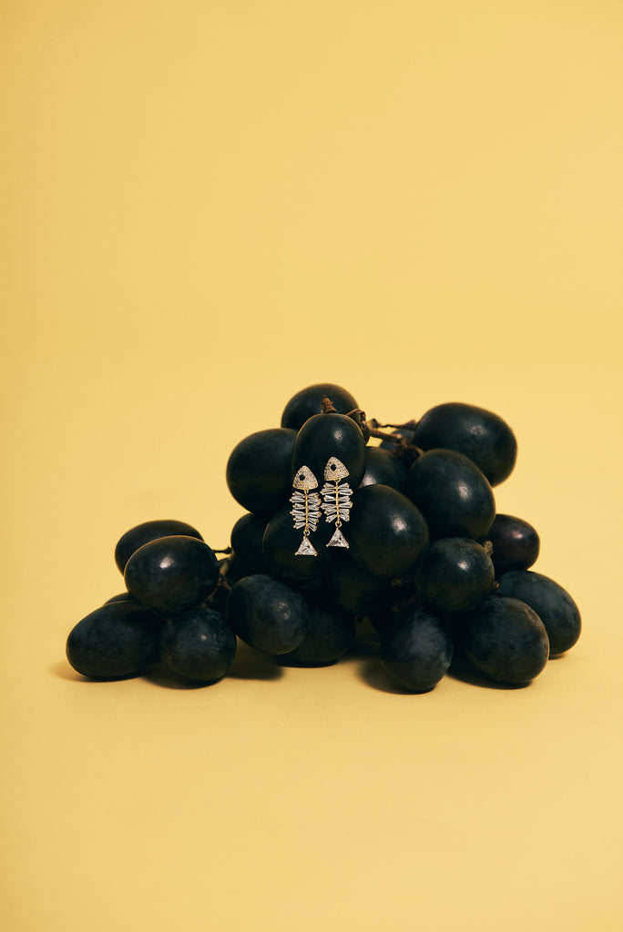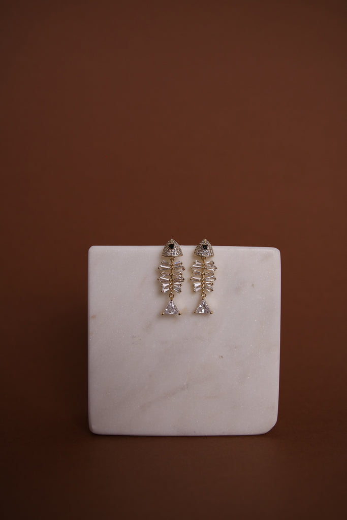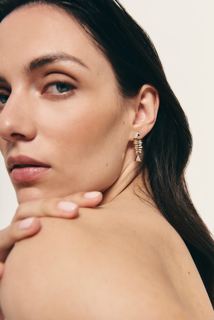 Los Pendientes Pesce son nuestro diseño más icónico y aclamado. Elaborados en Latón bañado en Oro de 18k, combinan un estilo artístico y moderno con la sofisticación de las circonitas talladas en baguette, brillante y triangular. Este pendiente en forma de esqueleto de pez es una obra de diseño única que refleja originalidad y lujo.
