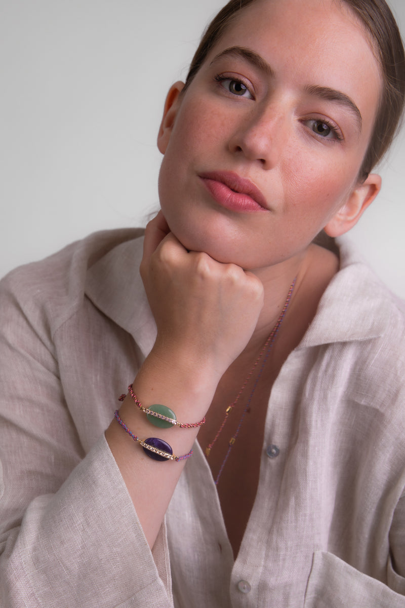 Este diseño tiene una gran piedra protagonista, Sodalita o Venturina rodeadas por unas circonitas pavé y un cordón multicolor con nudo corredizo.